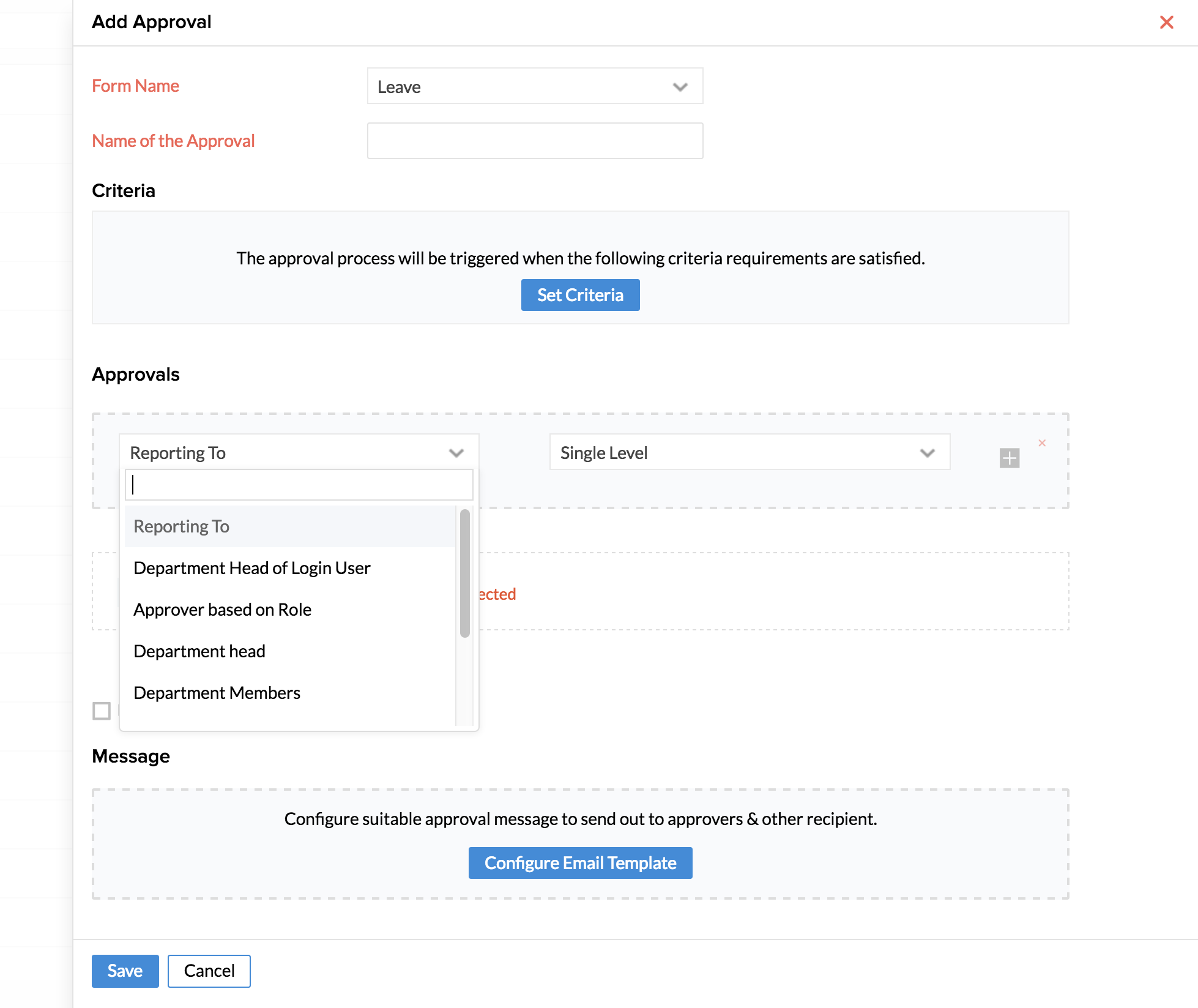 部门负责人:您的机构可能有各种部门,例如会计部、工程部、市场部、财务部等。如果您在部门字段中选择 Zoho 会计部,那么只有会计部负责人/经理才能够审批请求。
