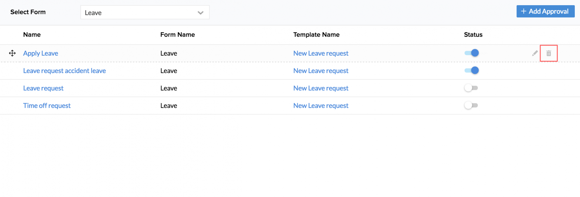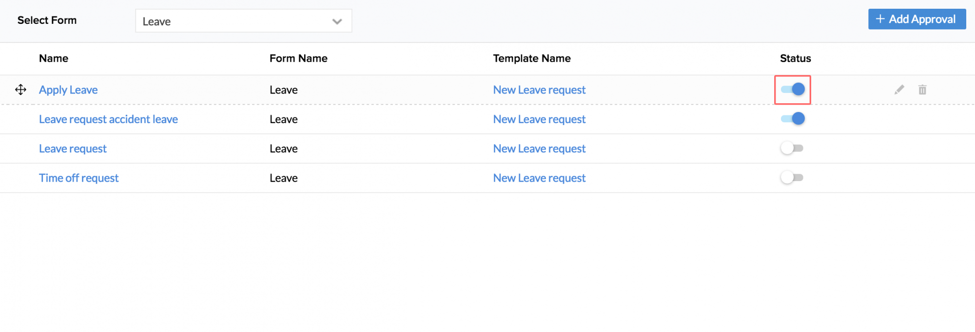 3.在审批列表页面,单击状态复选框以启用/禁用审批