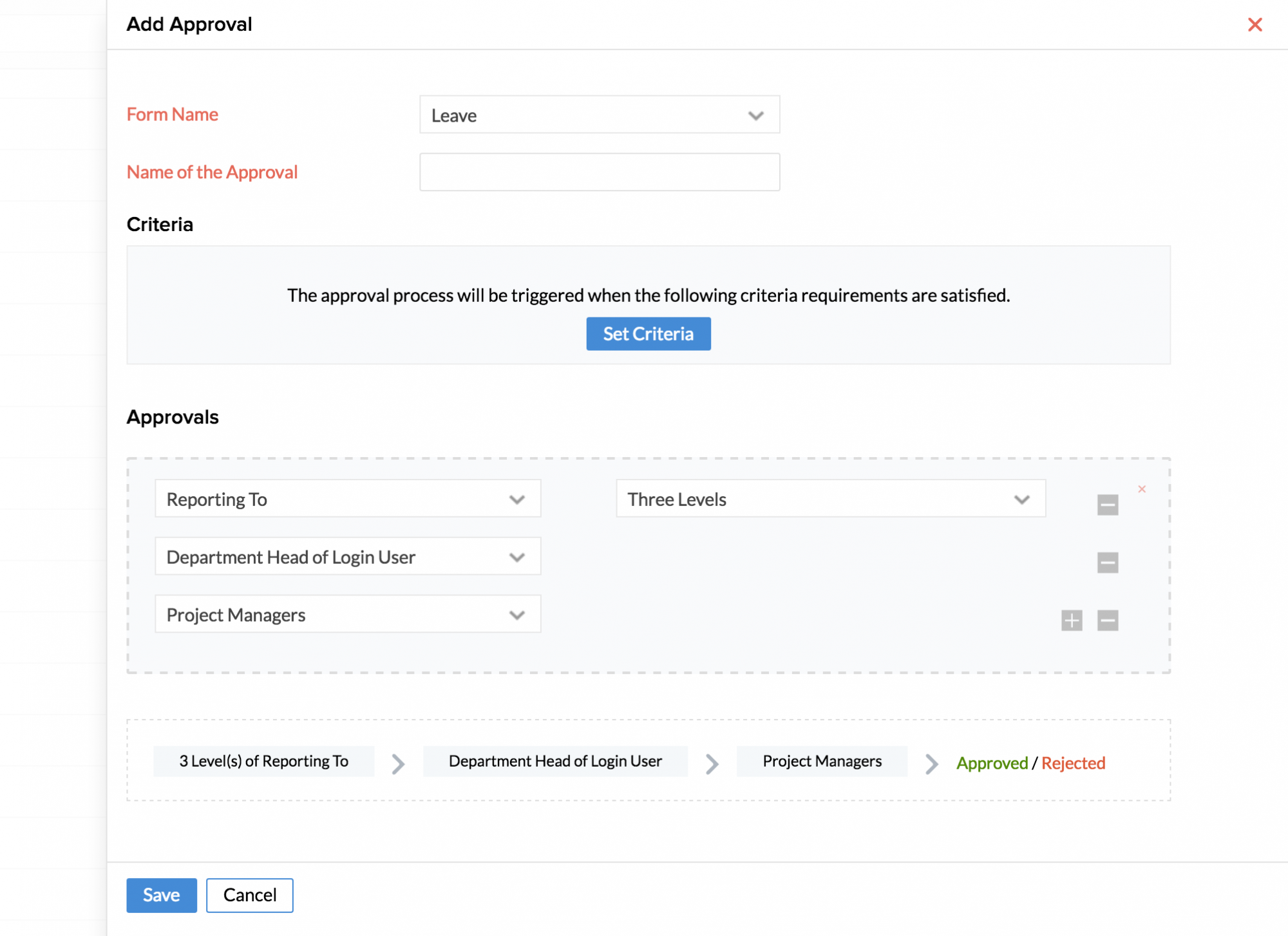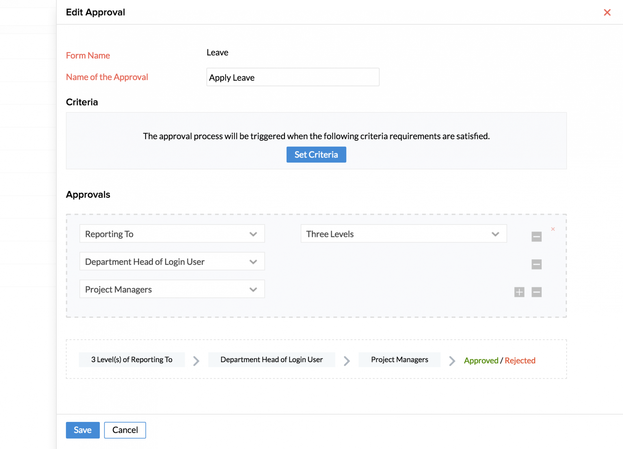 我们的审批流程是我们机构在 Zoho People 中审批记录的自动化流程。它还指定了当提交记录以供审批、拒绝和跟进时触发的工作流。