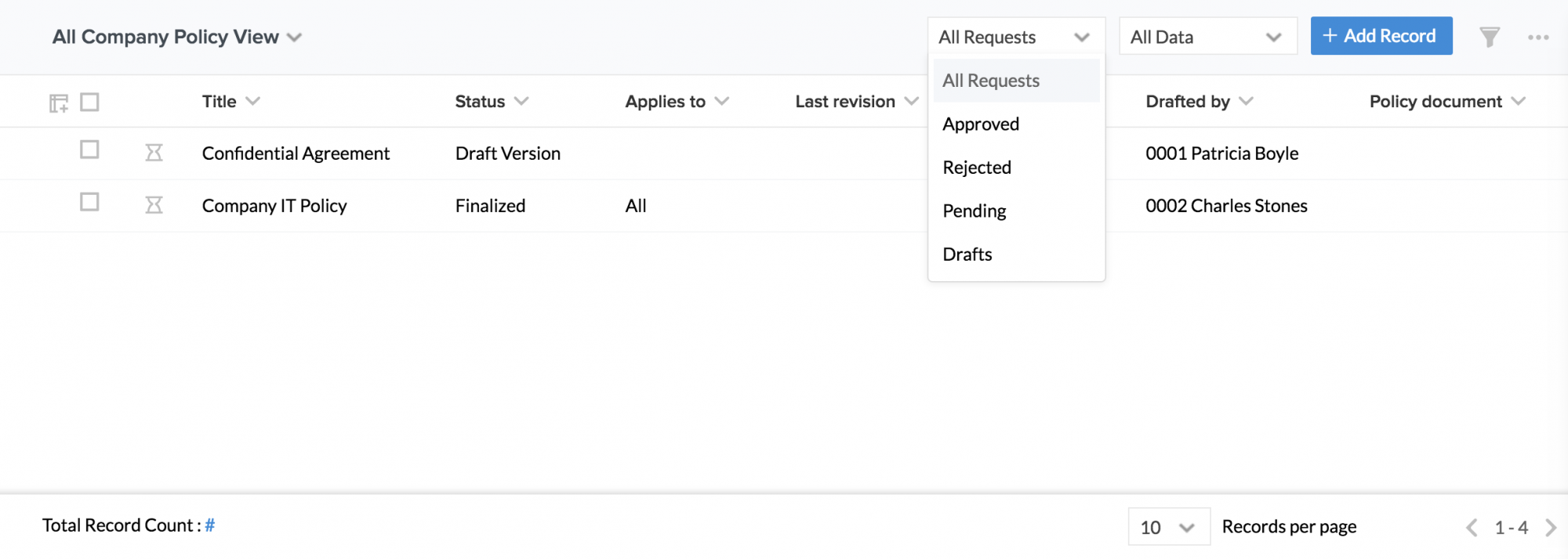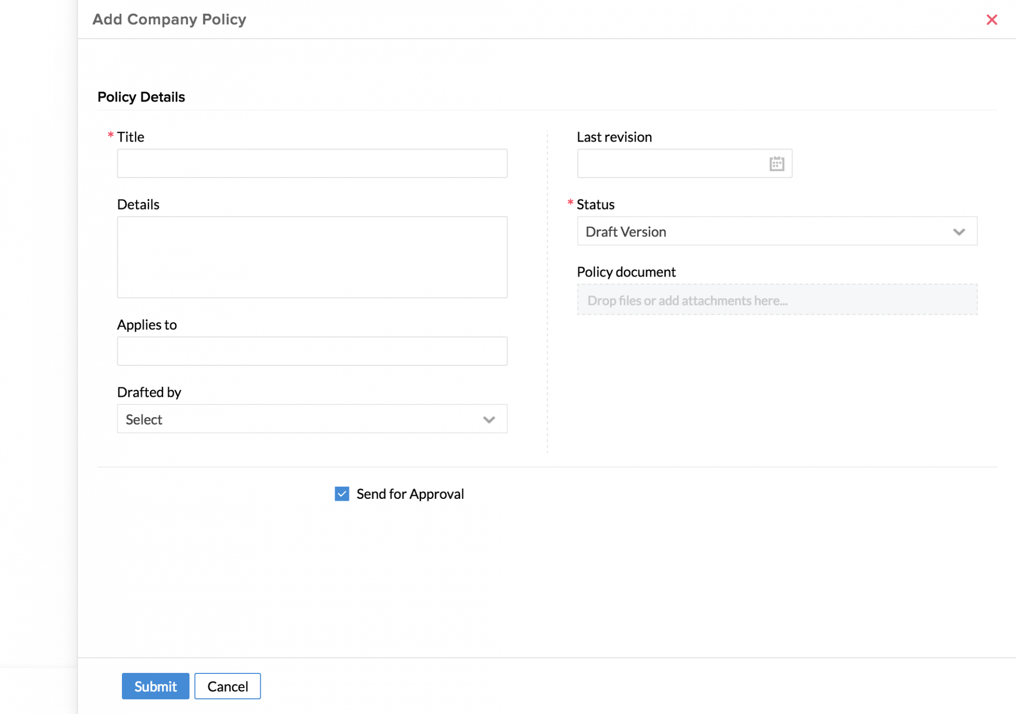 例如,在员工表单中添加记录时,您可能不知道员工的所有详情。在这种情况下,您可以在当前状态下保存表单,然后在填好所有详情之后再发送它以供审批。