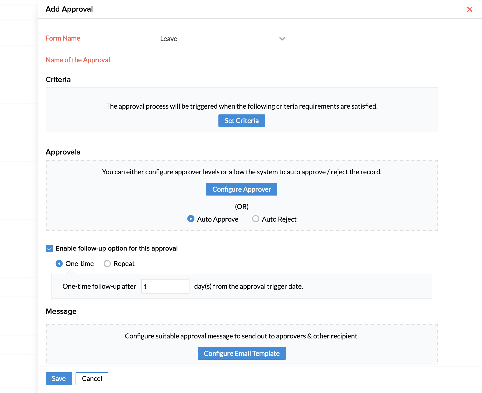 - 提供上述所有详情,然后单击启用此审批的跟进选项复选框