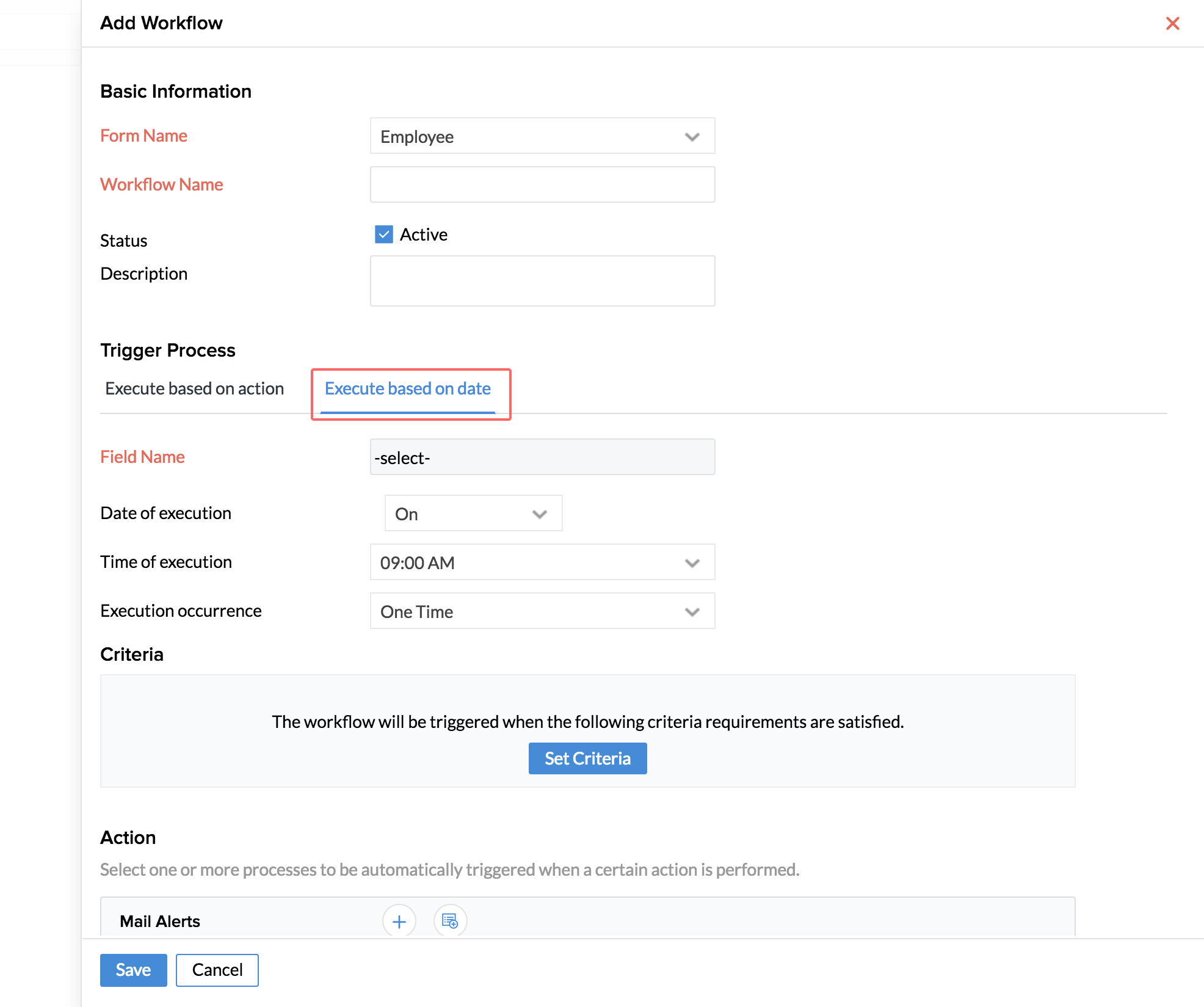 基于时间的操作:当给出特定执行时间时执行工作流。与提醒相比,基于时间的操作是一项高级功能。与提醒不同,此功能有助于仅在给出带有特定执行时间的创建或编辑等操作时才触发工作流。此功能的亮点是为员工创建一次性提醒,提示员工注意在指定时间执行任务。您可根据需要配置“邮件提醒”、“工作清单”和 Webhook 列表。