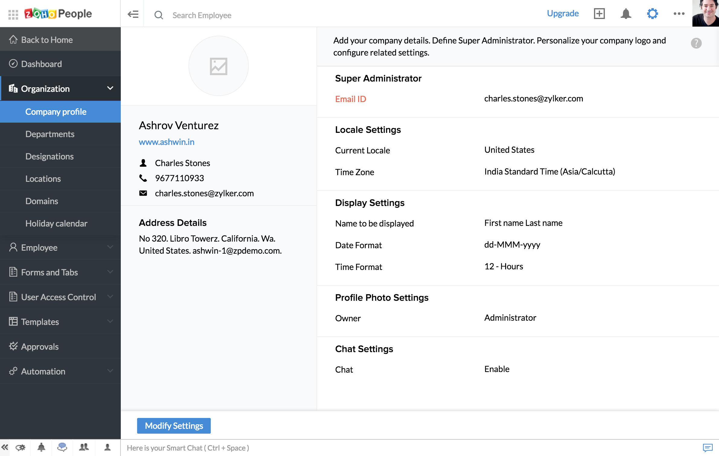 您可使用自己的自定义Logo来替换 Zoho People Logo。您公司的Logo将显示在 Zoho People 帐户的顶部。您的Logo必须与指定的大小一样。创建 80 * 55 大小的Logo以获得最佳分辨率。