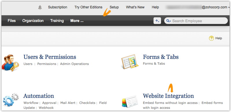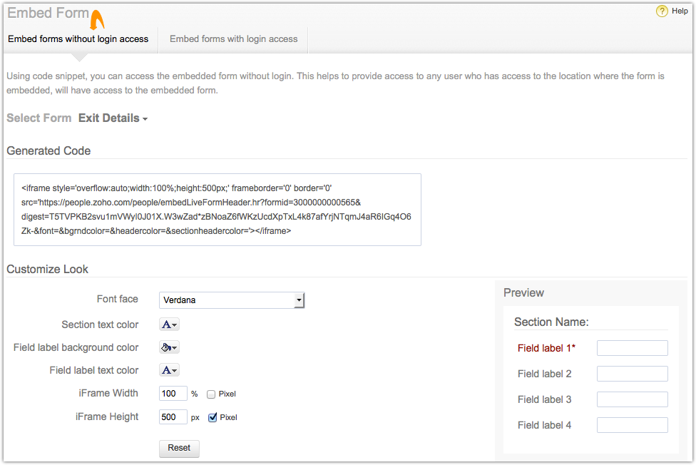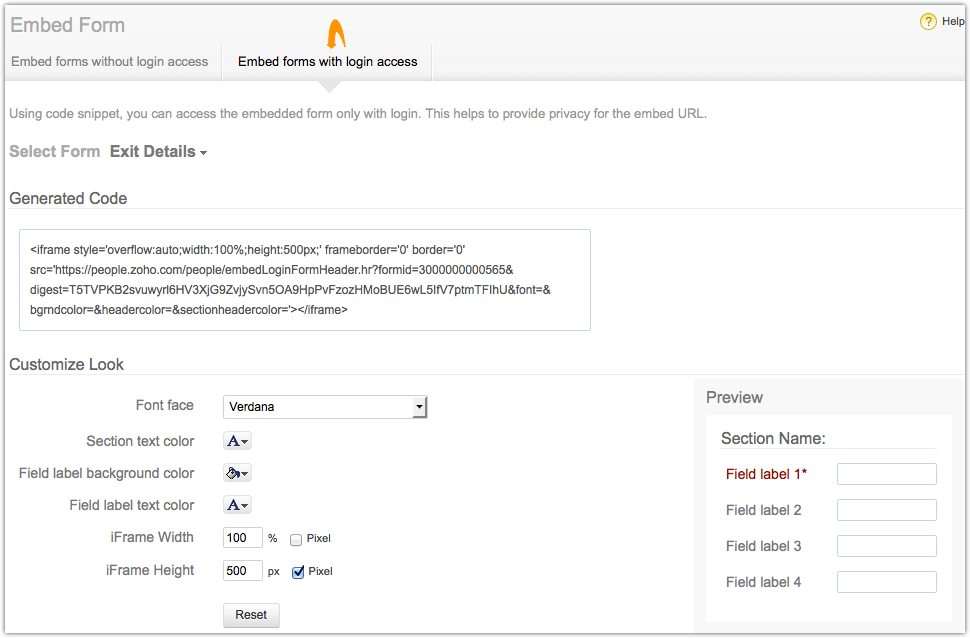 在线发布网页表单以及将记录从您的网站直接添加到 Zoho People 表单。嵌入含登录访问的表单有助于提供嵌入 URL 的隐私。嵌入不含登录访问的表单有助于为具有嵌入表单地点和嵌入式表单访问权限的用户提供访问权限。