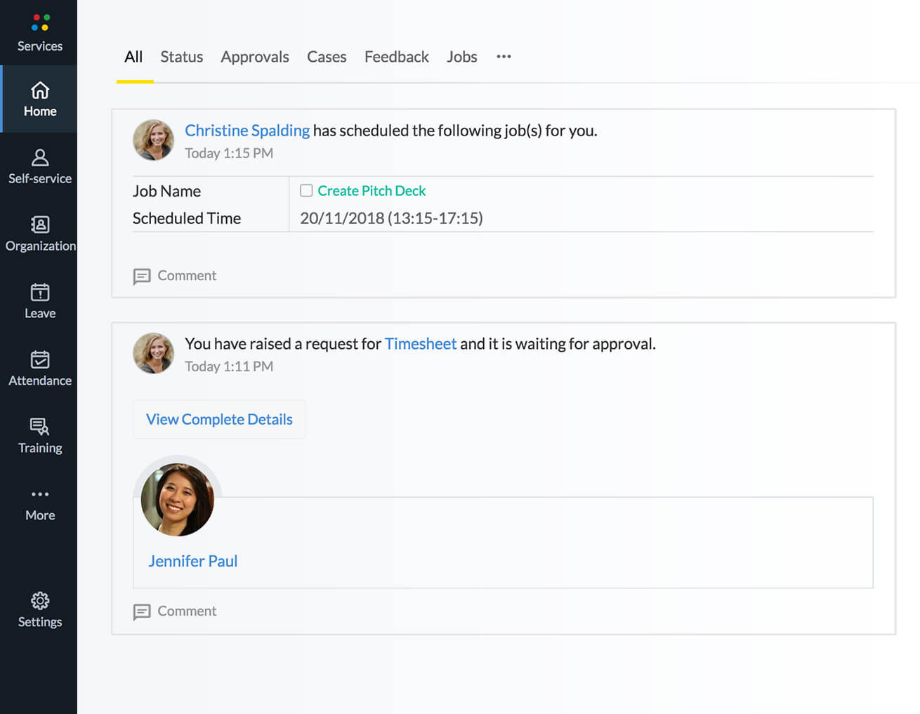 使用 Zoho People 的聊天和动态集成功能以及跨团队分组和移动应用,员工可以实时相互联系以开展协作项目。