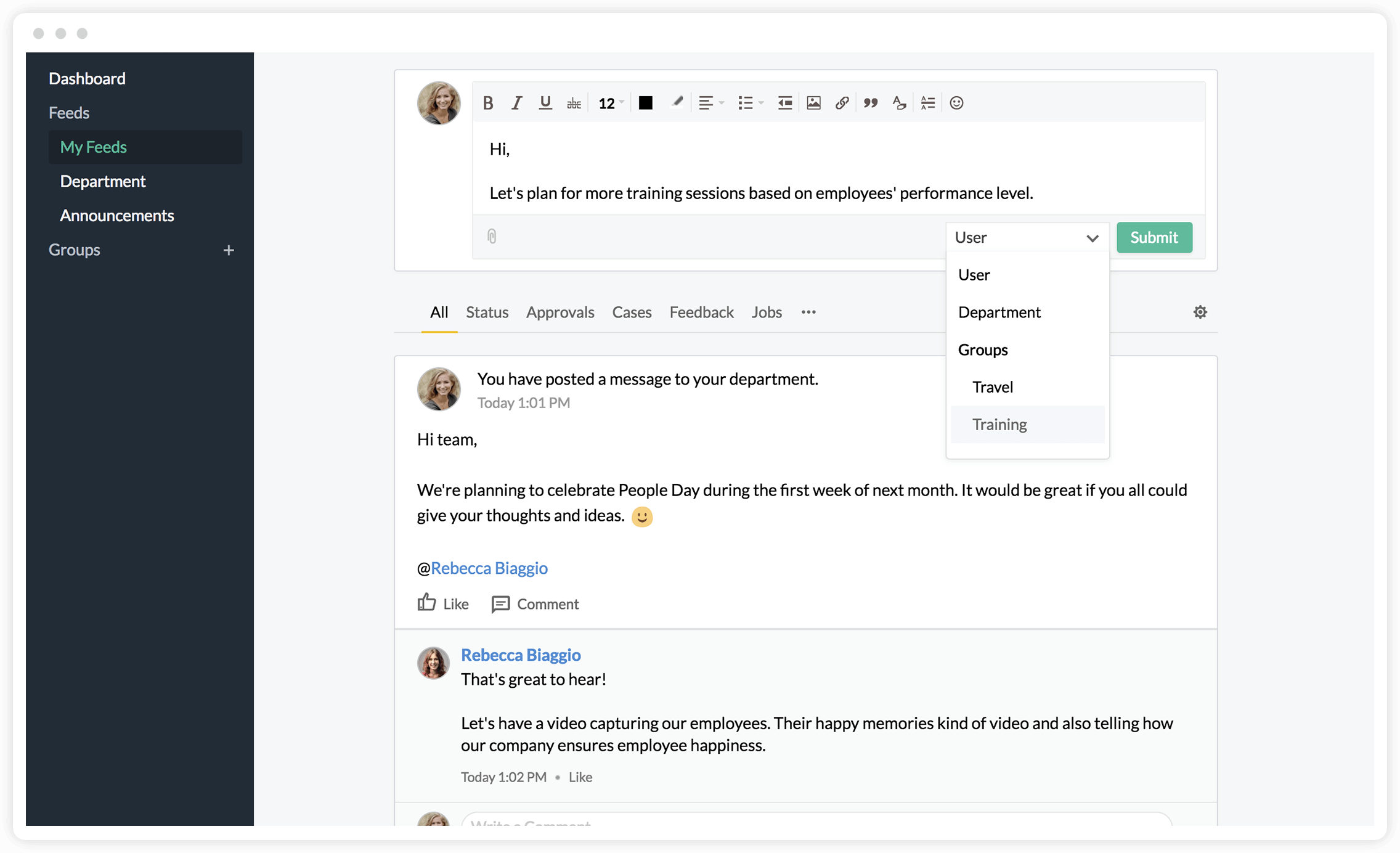 拥有相关的信息是有效协作的关键。您可以将消息发布到您的组、部门,甚至个人。