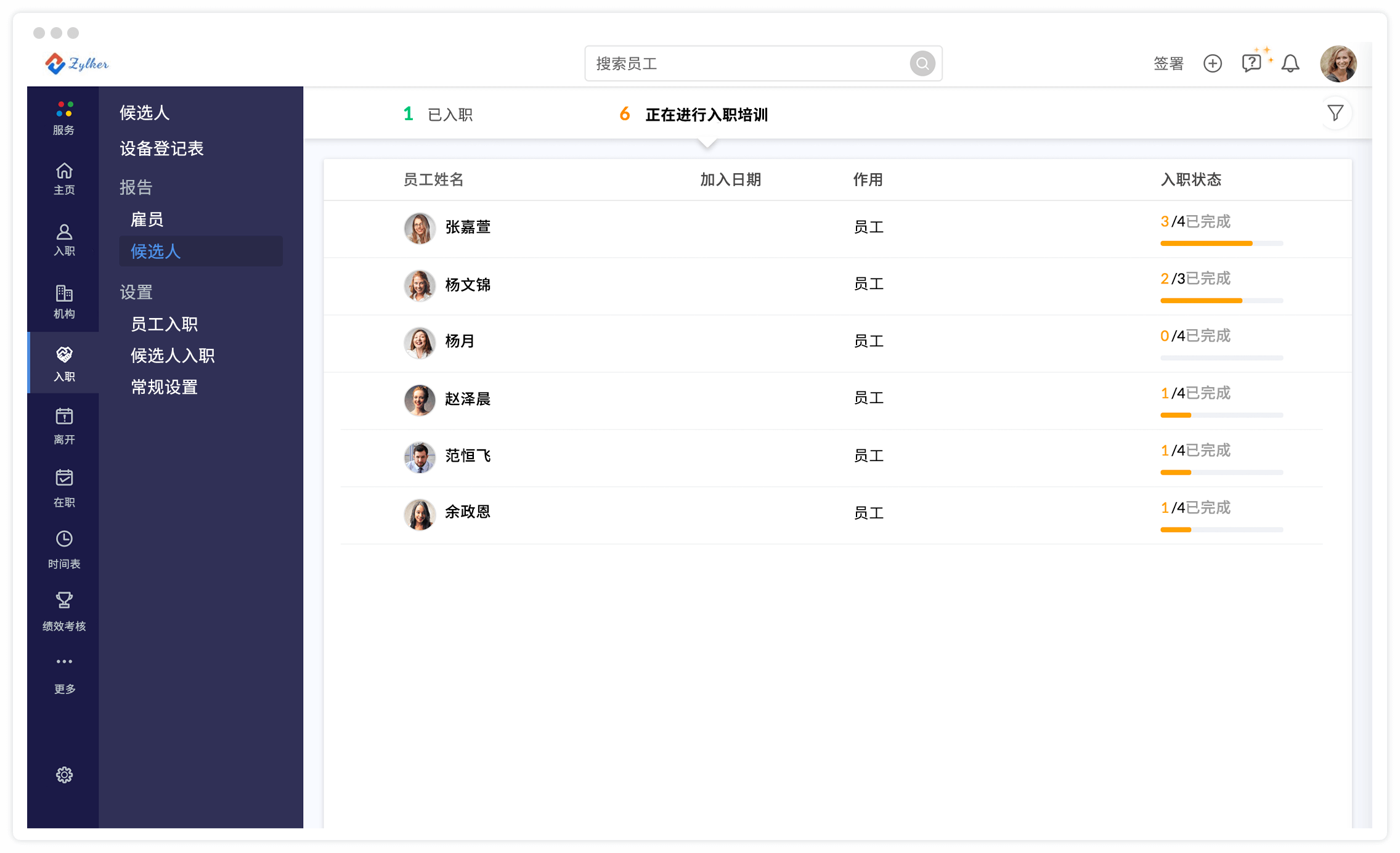 在一个窗口中跟踪新员工入职的任务完成状态——已入职的员工和仍在进行中的员工。 筛选选项可帮助您跟踪员工在每一步的任务完成情况,并查看有关新员工入职流程状态的报告。