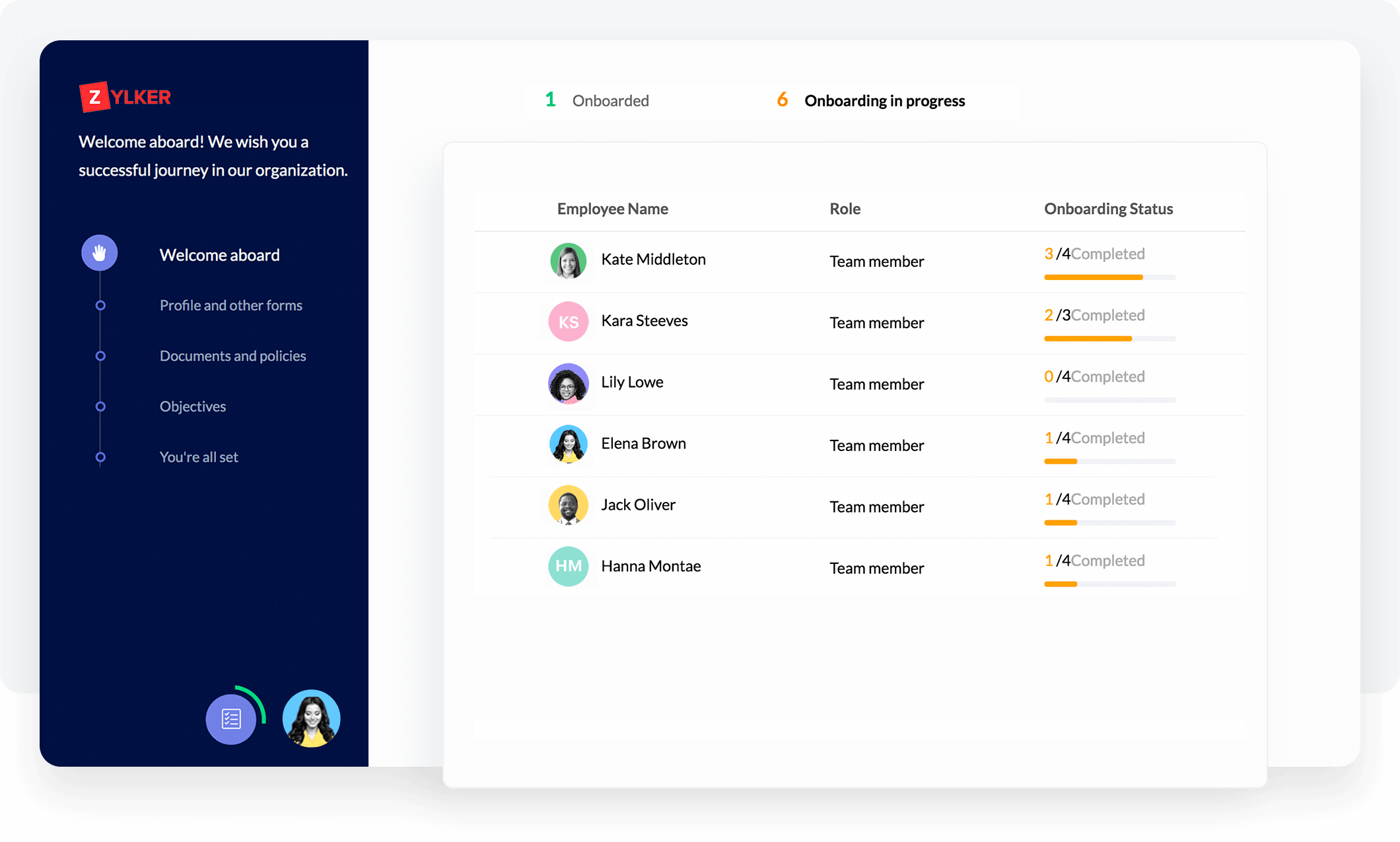 Zoho People 员工管理系统可以帮助新员工了解公司情况。在其从求职者成功升级成为员工后,应该为其提供更多信息,包括描述工作目标、介绍内部流程、介绍团队等。