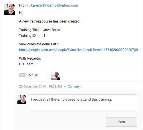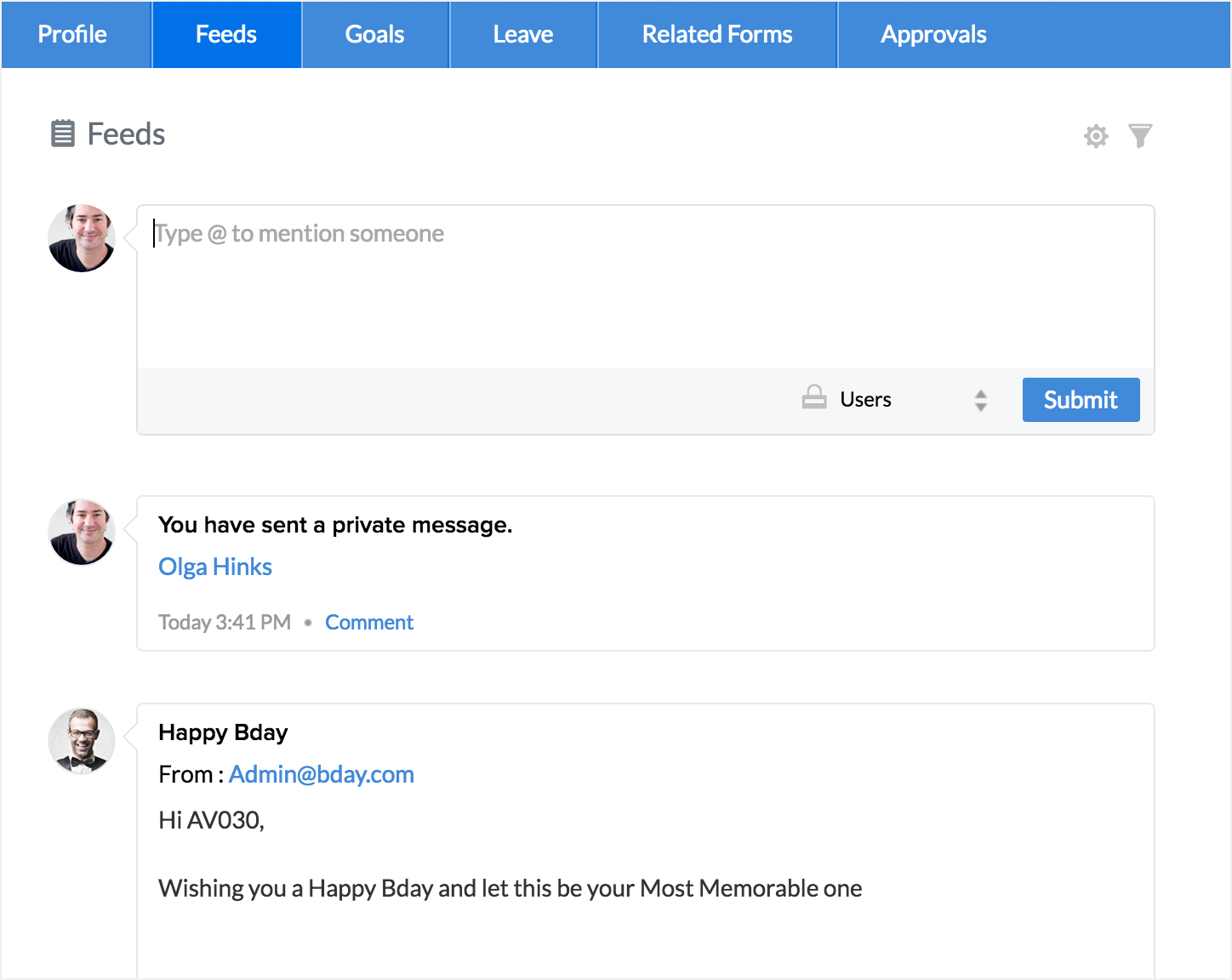 通过Zoho People的通知和消息功能,您可以向所在的部门发布消息或@某个同事。也可以直接向公司中的任何人发送私人消息。只需输入消息。点击发送即可。