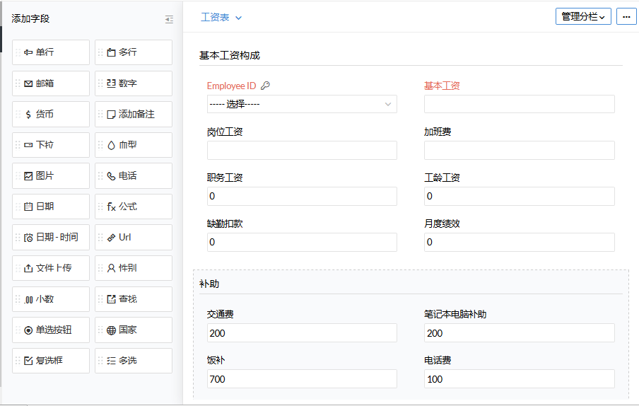 Zoho People强大的自定义功能,可支持用户自行修改工资表单,提供文本、数字、附件上传、公式等22种拖拽式字段,轻松自动计算员工工资和福利,解放HR。