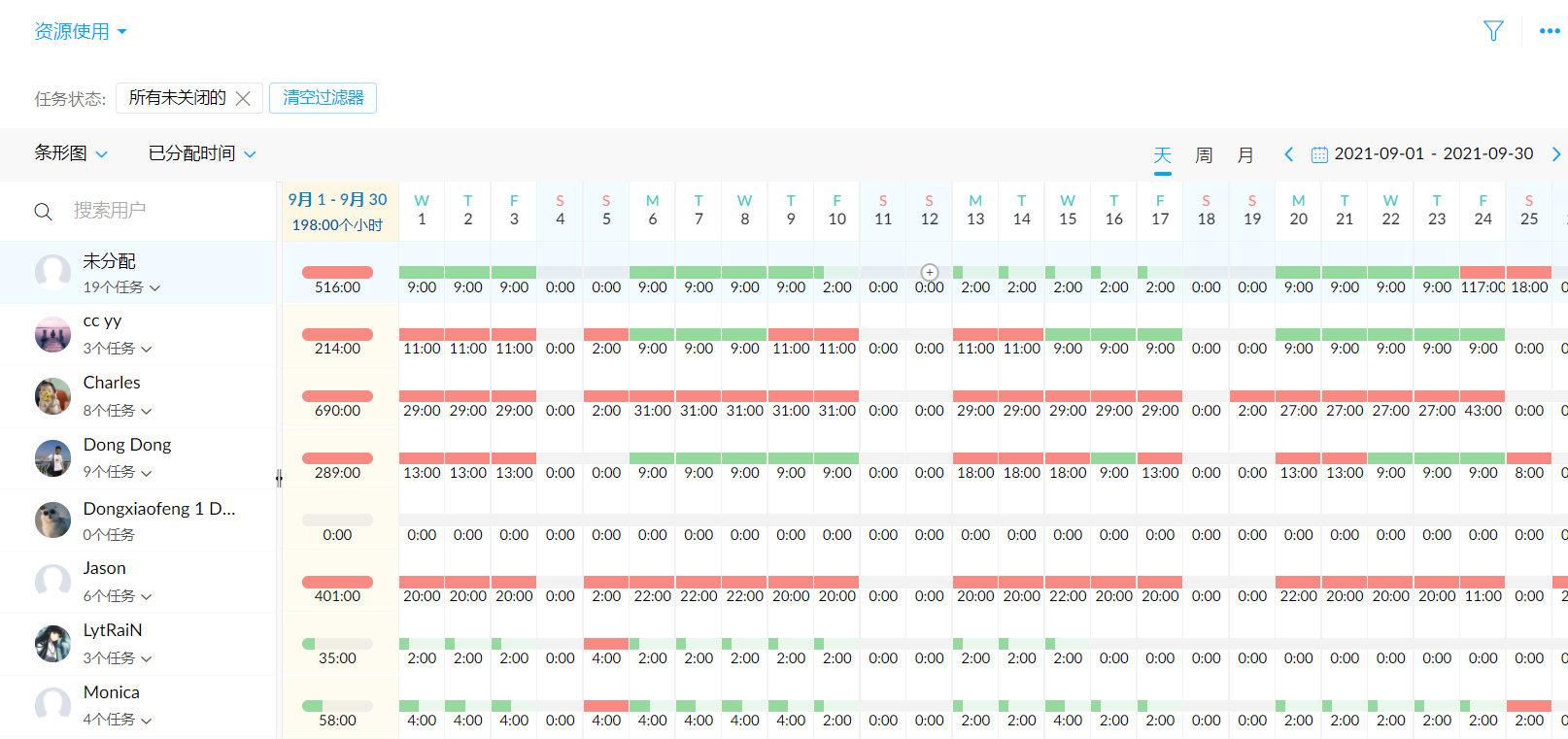 通过资源利用图,您可以全面地了解团队中的哪些人的任务负担过重、哪些人有空闲,从而做出合理的任务分配。