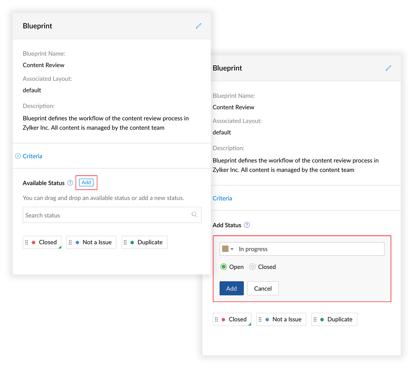 创建蓝图之后,您可以在蓝图编辑器中自定义其设计。将状态从“可用状态”部分拖放到蓝图编辑器中或添加新任务状态。