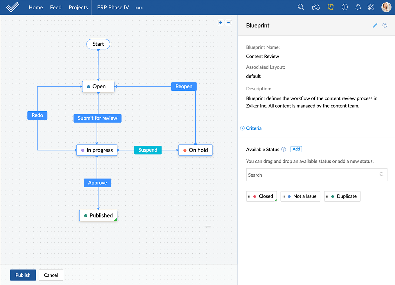 Zoho Projects 蓝图帮助您定义和设计工作流,让流程以有条理的方式自动执行。蓝图的主要组成部分是状态和迁移: