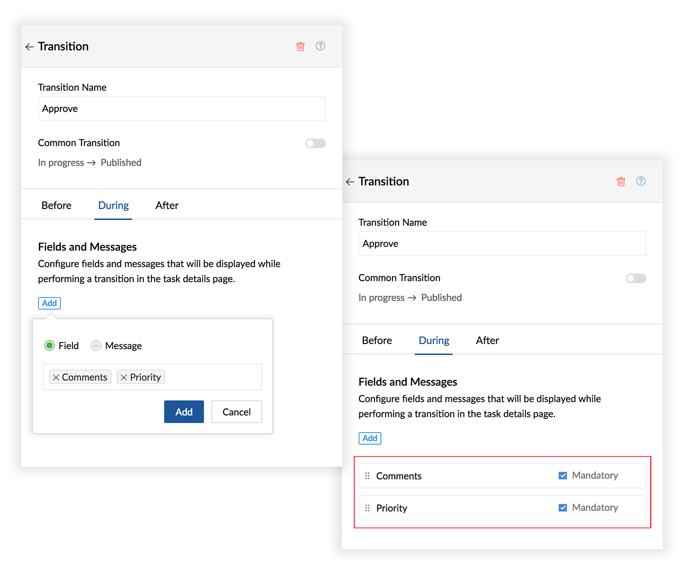 例如,在审批迁移的迁移期间配置中,“注释”添加为必填字段,“审核流程将在此迁移之后完成”添加为消息。这意味着当经理执行审批迁移时,系统会提示他们添加注释,并且会在弹出窗口中看到显示的消息。
