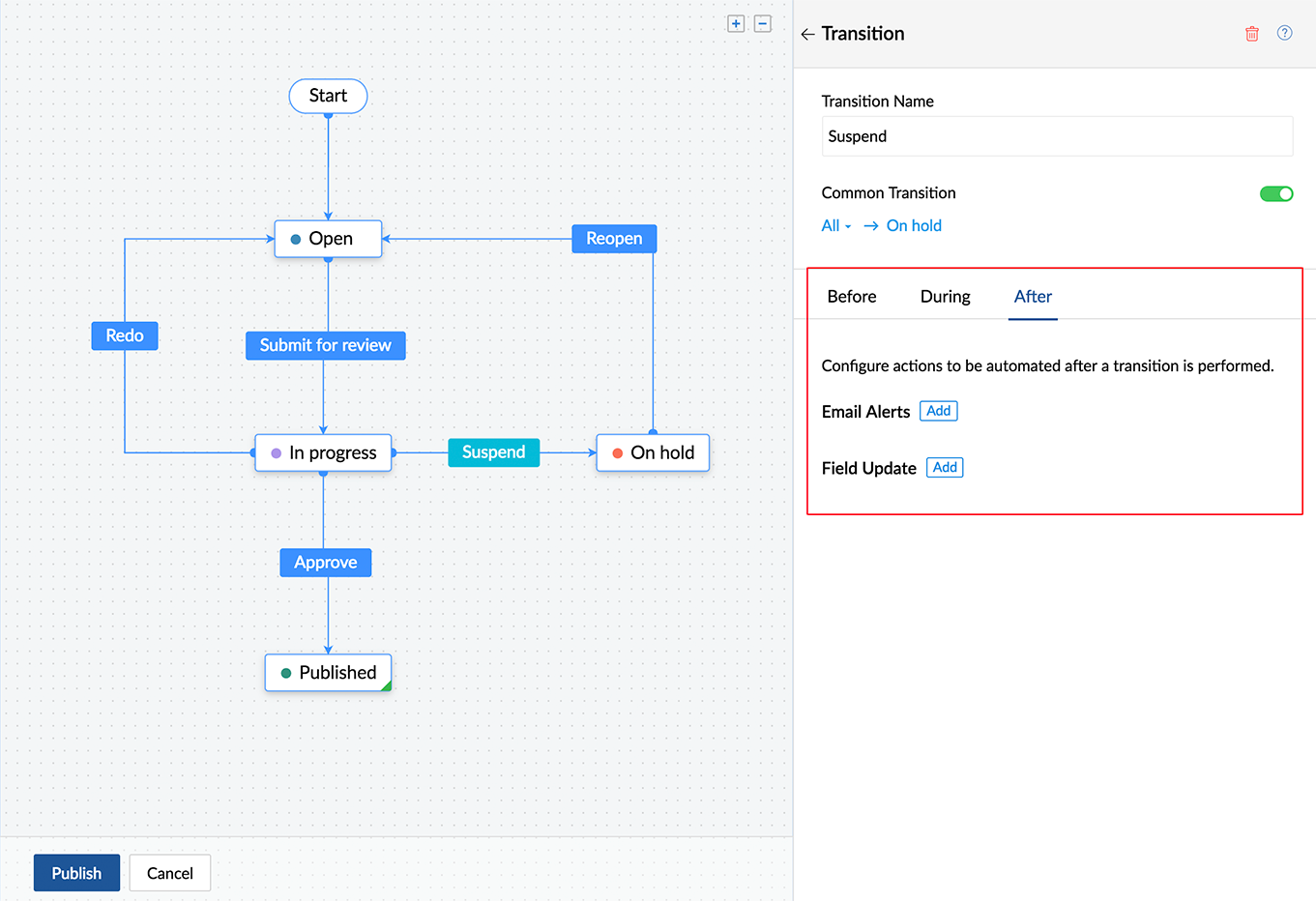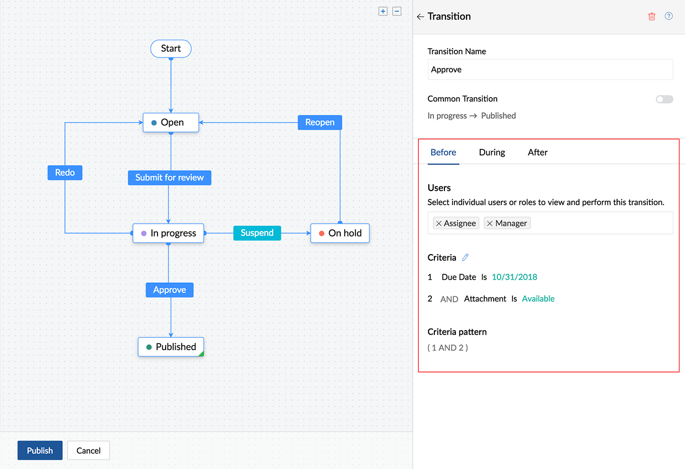 配置好您所需的所有状态和迁移之后,您可以发布蓝图。发布蓝图后,匹配蓝图条件的任务将遵循蓝图中定义的流程工作流。