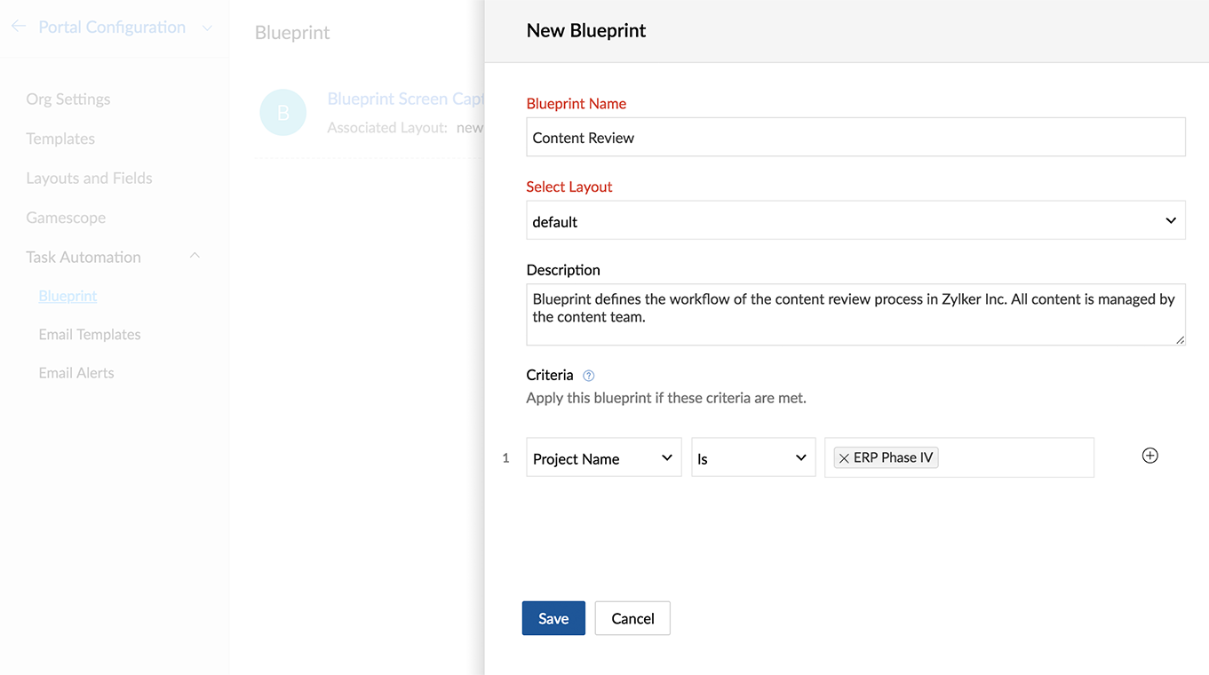 > 门户配置 > 任务自动化 > 蓝图以创建蓝图。如果您是管理员,但不能访问上述路径,请写信至 support@zohocorp.com.cn