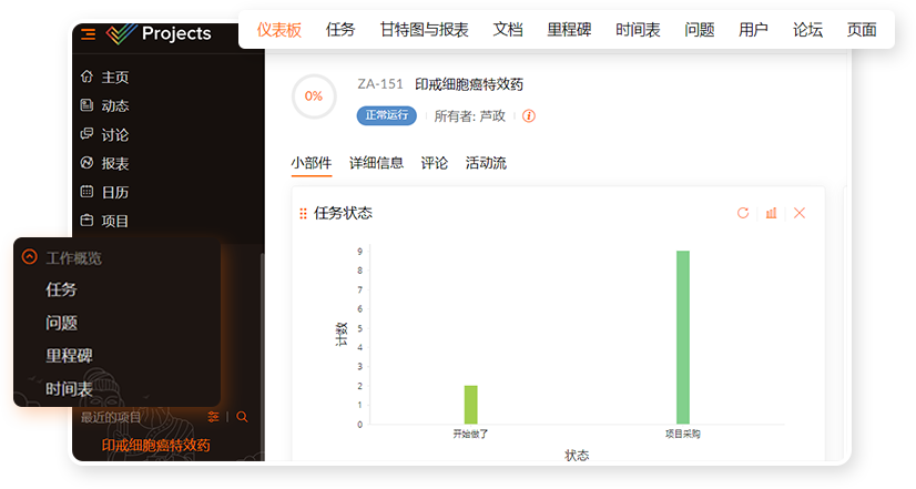 新药研发人员每天要做大量的实验,都比较忙,如果还要花很多时间去学习使用复杂的系统,只会让系统使用者产生反感情绪。Zoho Projects项目管理软件架构清晰,页面简洁,易操作,上手快。