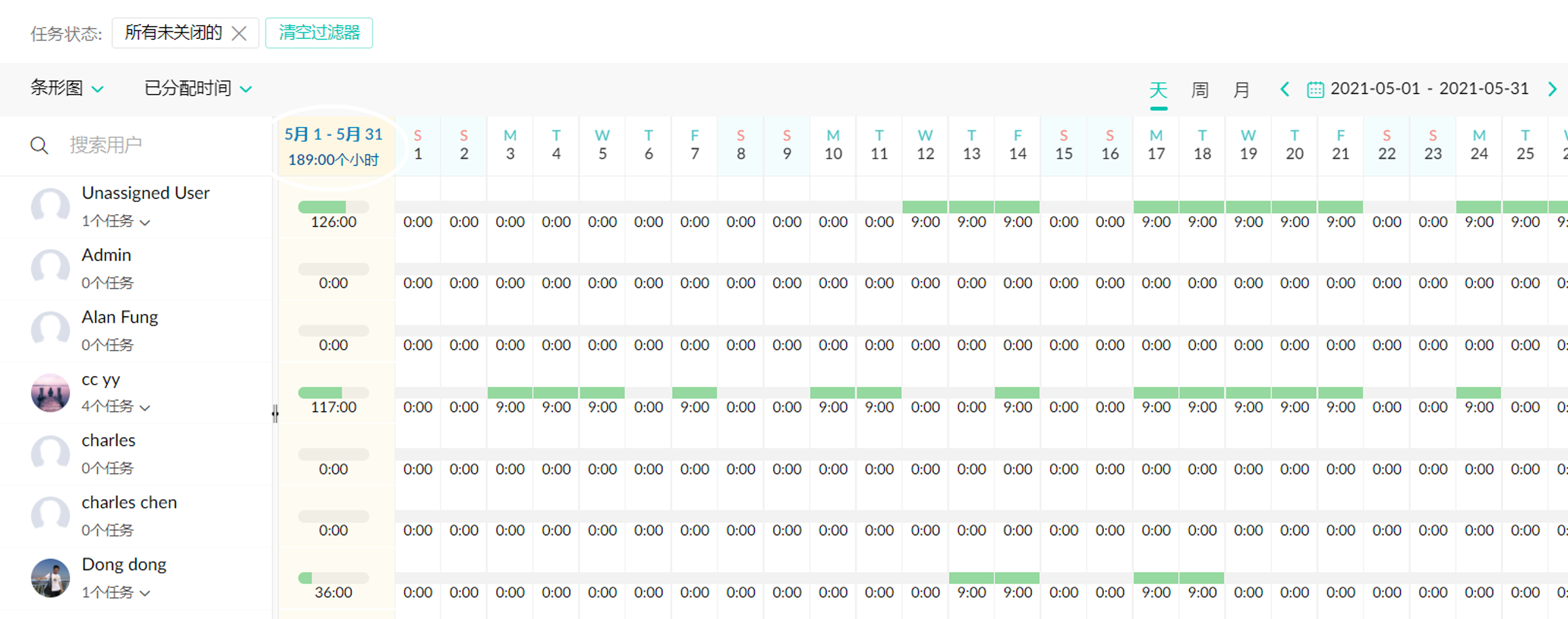 如果您需要了解团队在特定时间段的日程安排,可以通过资源利用图按天、按周或按月查看任务分配计划,您还可以自定义查看的日期范围。