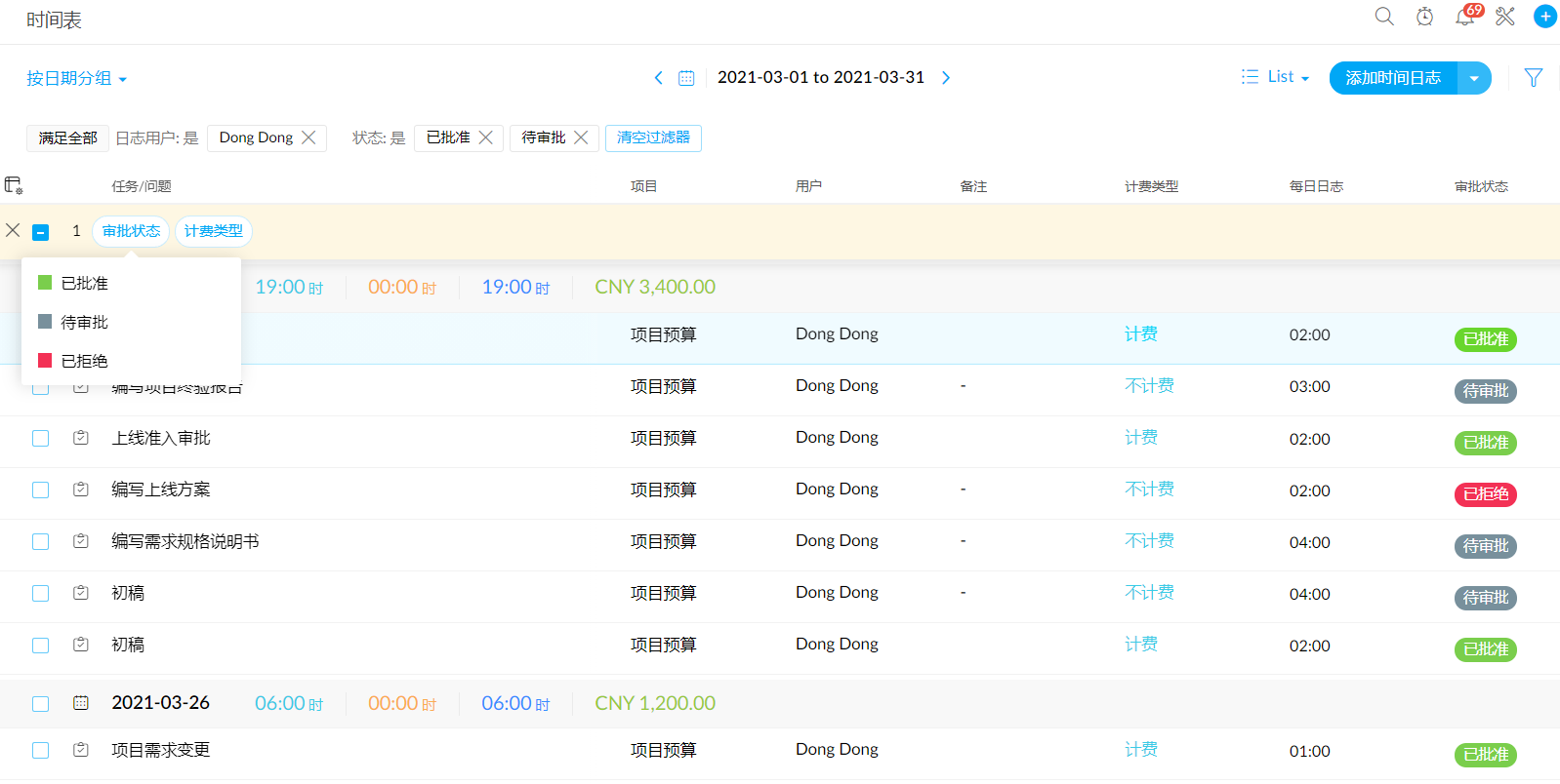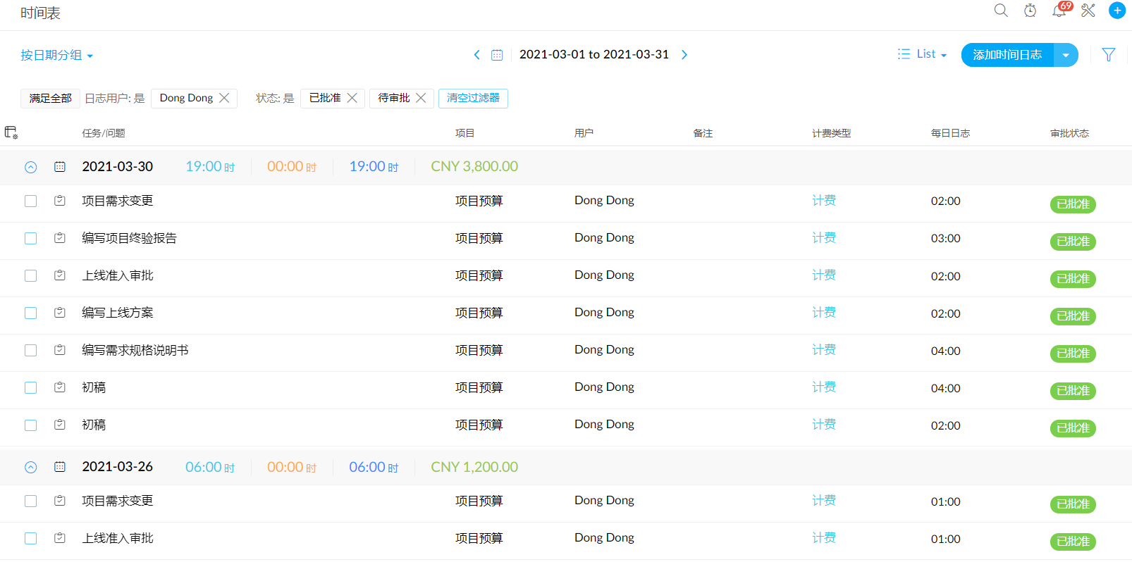 项目工时表报表作为每个项目工时的一览图,清楚地展示所有的任务用时,也可以看到每个任务或每个员工的工时记录。