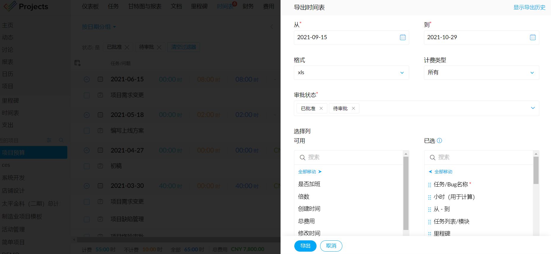 您可以导出特定用户或项目或门户中所有用户的工时表,支持xls、csv 和 pdf等格式。