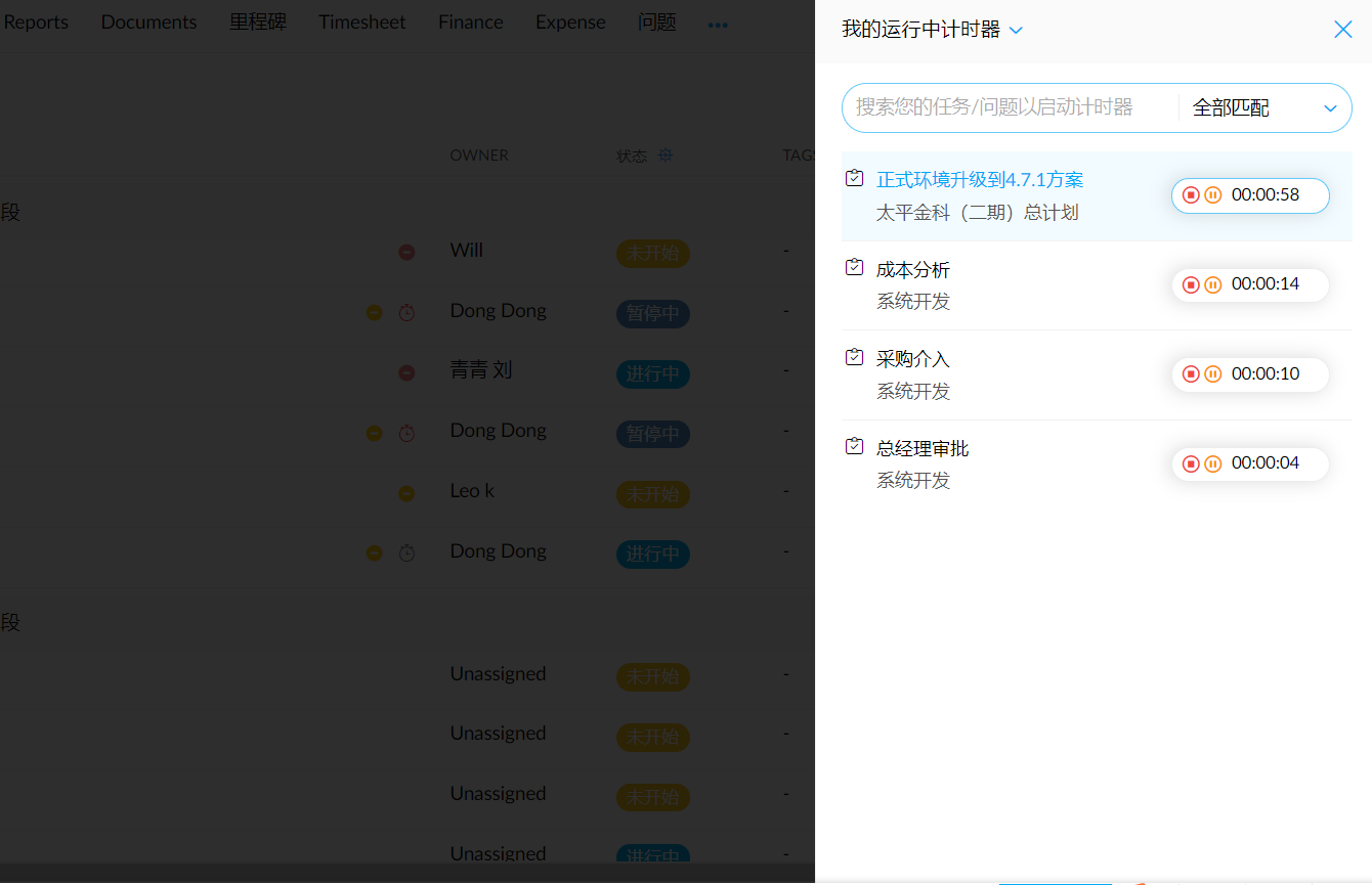 全局计时器小部件可以跨项目跨任务地显示所有工时表,您可以启动、暂停或停止计时器,并通知到团队成员。