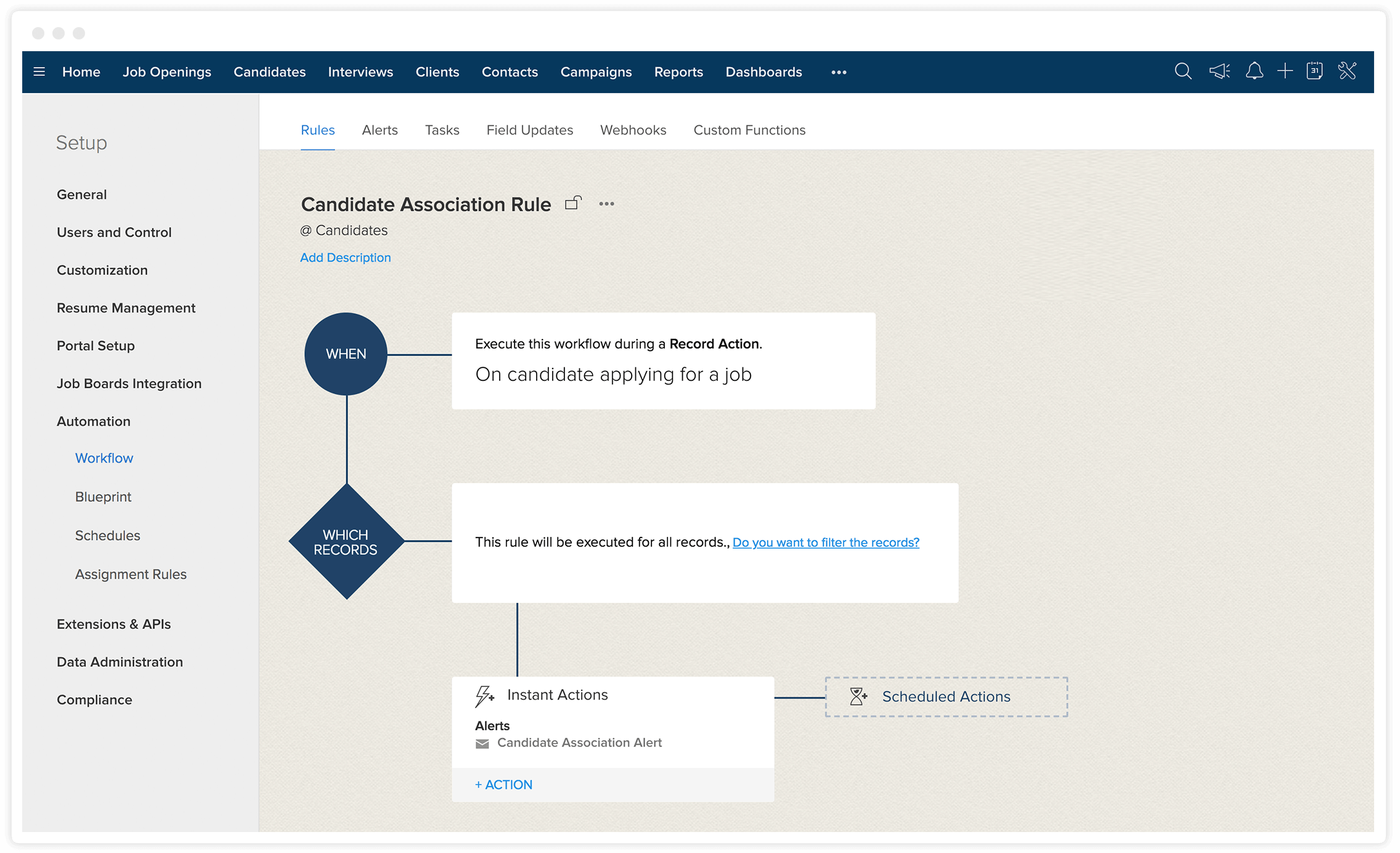 通过标准化工作方法改进业务流程。没有任何两家企业完全相同,企业的招聘流程也是多种多样的。Zoho Recruit 基于 AI 的招聘平台允许您对现有的自定义字段进行进一步自定义,以及添加额外的自定义字段和添加自定义状态。实现招聘 AI 平台自动化,根据预定义的标准将任务分配给用户。当某个规则被触发时,与该规则关联的提醒、任务和字段更新也将被触发,从而优化招聘人员的工作效率。