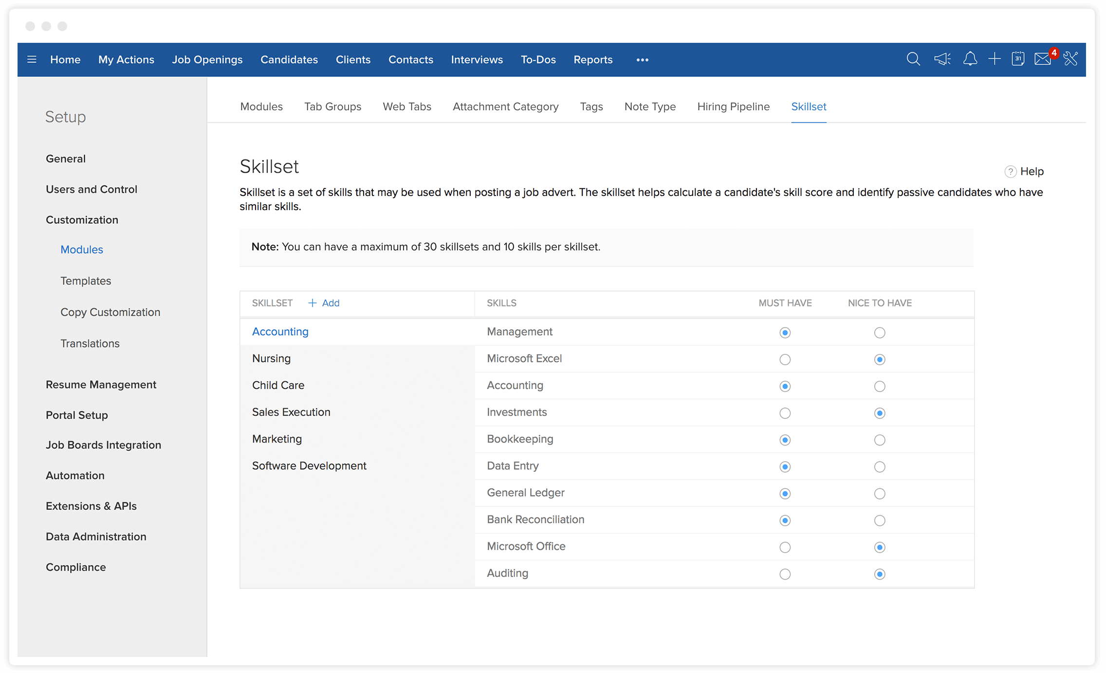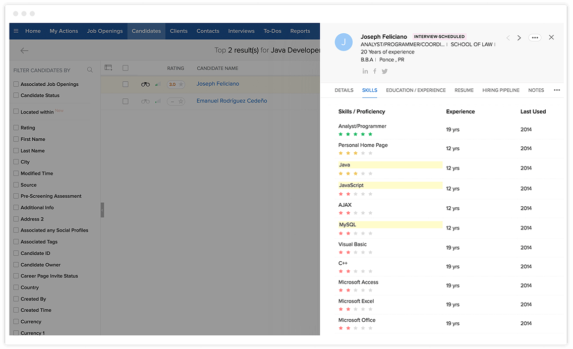 在职位发布前,设置空缺职位的必要技能和加分技能。Zoho Recruit 的人工智能招聘平台能够计算申请人的技能得分,并在数秒内识别出合适的应聘者。