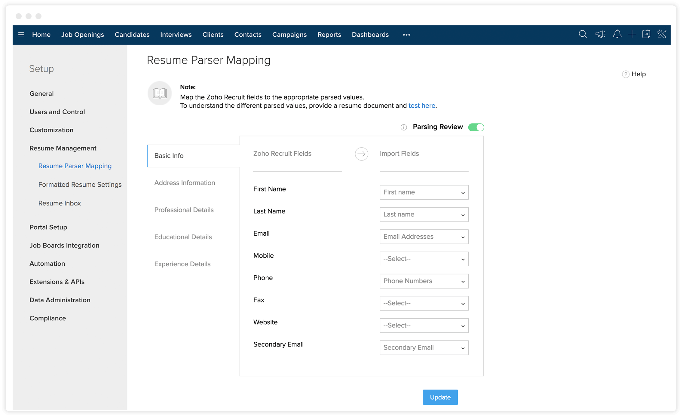 Zoho Recruit 的简历分析器强大、快速、准确。采用人工智能和专有算法的简历分析器映射可帮助您对所解释的简历结构进行标准化,并使之与组织支持的表单保持一致。它允许您将 Zoho Recruit 字段映射到解析出的简历中的相应字段。减少手动简历分类工作,我们的简历分析器可以在不到一秒钟的时间里完成工作。