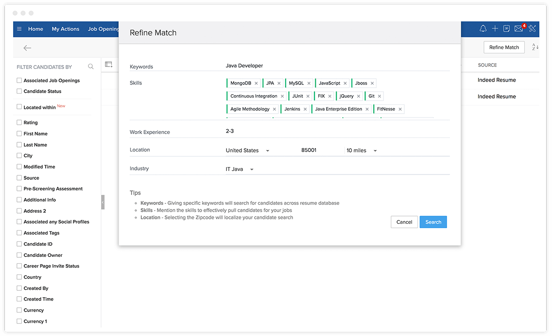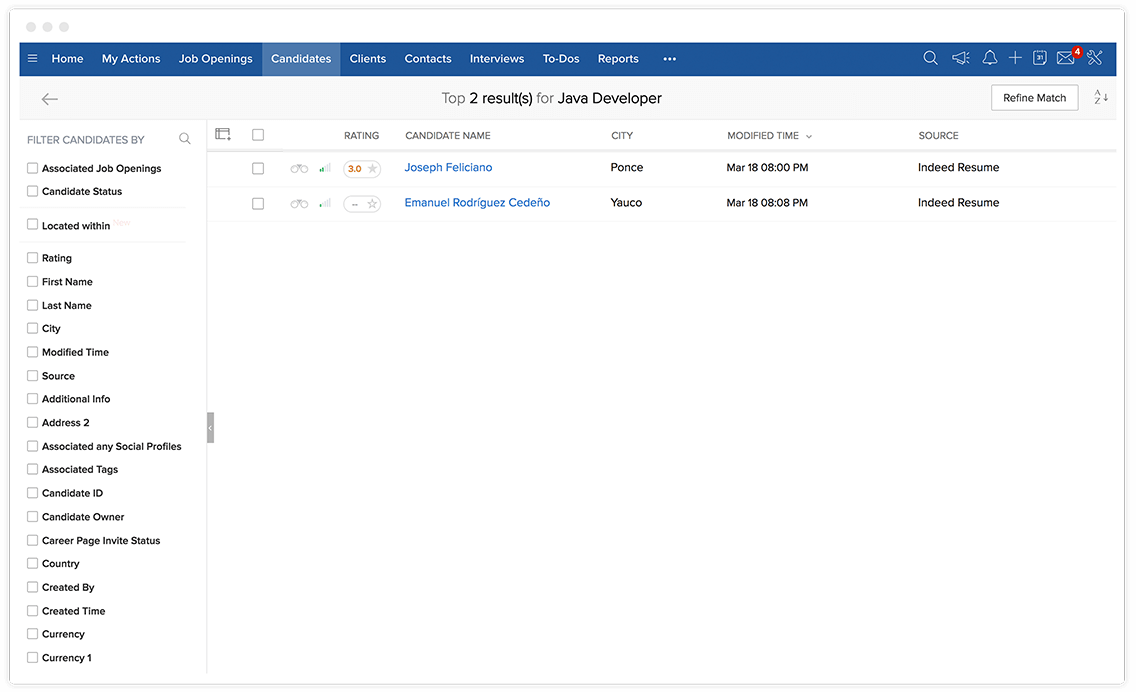 无论您的应聘者数据库有多大,Zoho Recruit 的算法都能在几毫秒内匹配您的职位描述中列出的所有关键标准。只要执行一次“查找匹配的应聘者”操作,您就可以在几秒钟内获得推荐应聘者的完整名单。