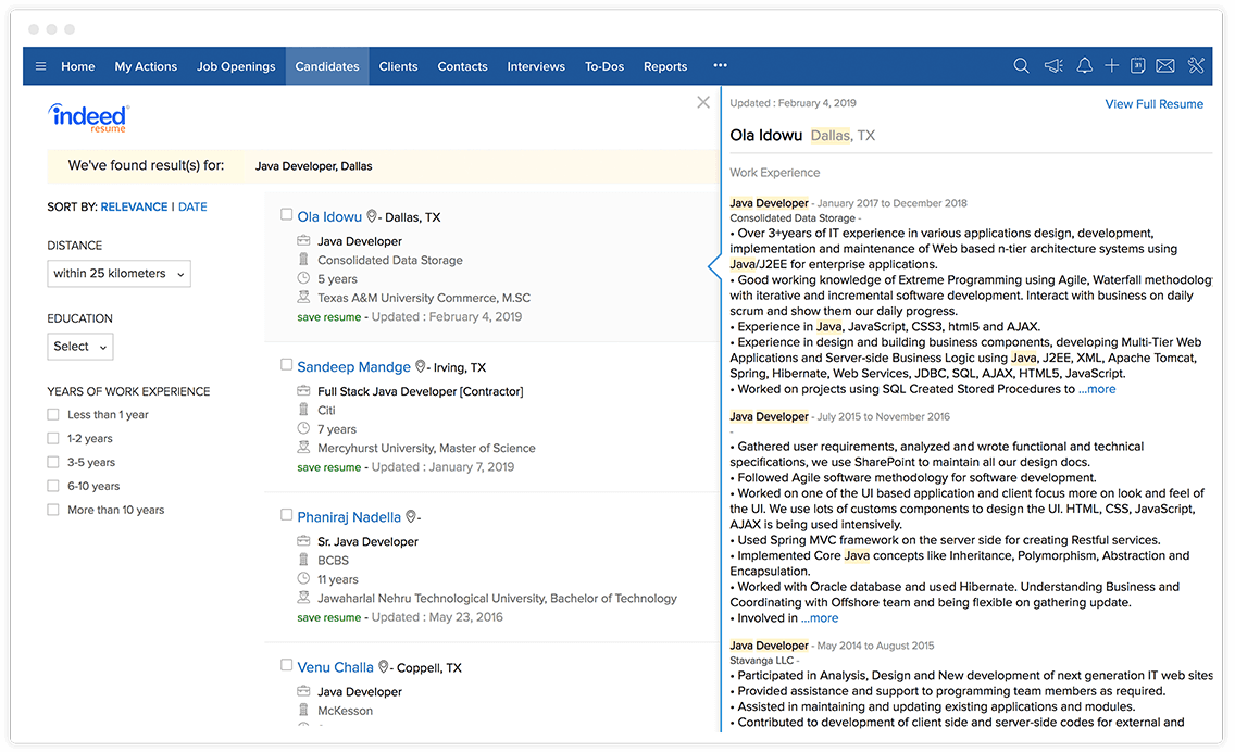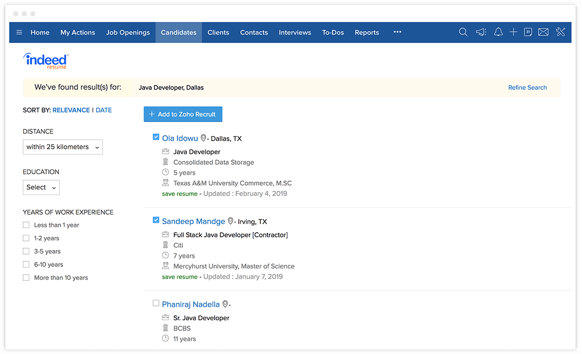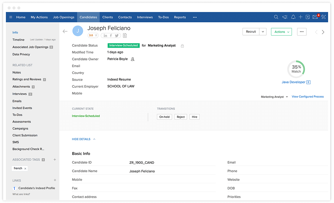 查找最适合职缺的应聘者,选择他们的简历,然后只需单击按钮即可将他们添加到 Zoho Recruit 中。后续,如果应聘者通过了后续几轮面试环节,则可以将其状态移至下一阶段。