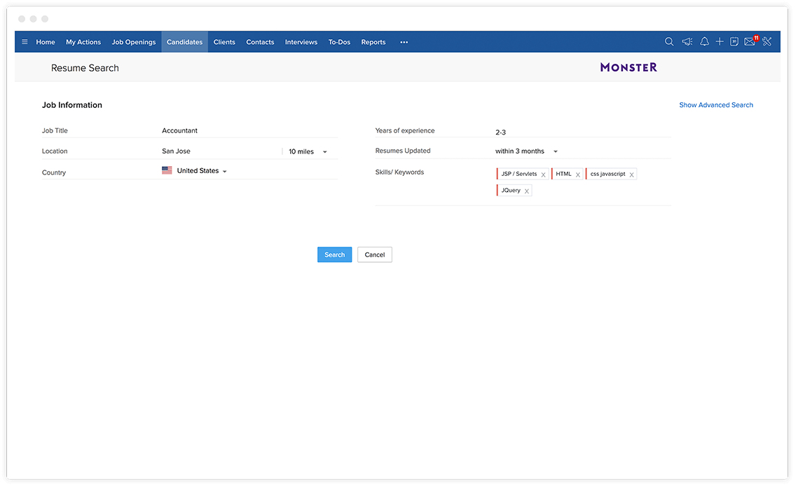 使用我们的易于使用的先进应聘者搜索功能,即时访问无限数量的简档。填写基本要求,如职位或必要技能,搜罗优秀人才。此外,使用我们的高级搜索过滤器可逐渐缩小应聘者搜索范围。
