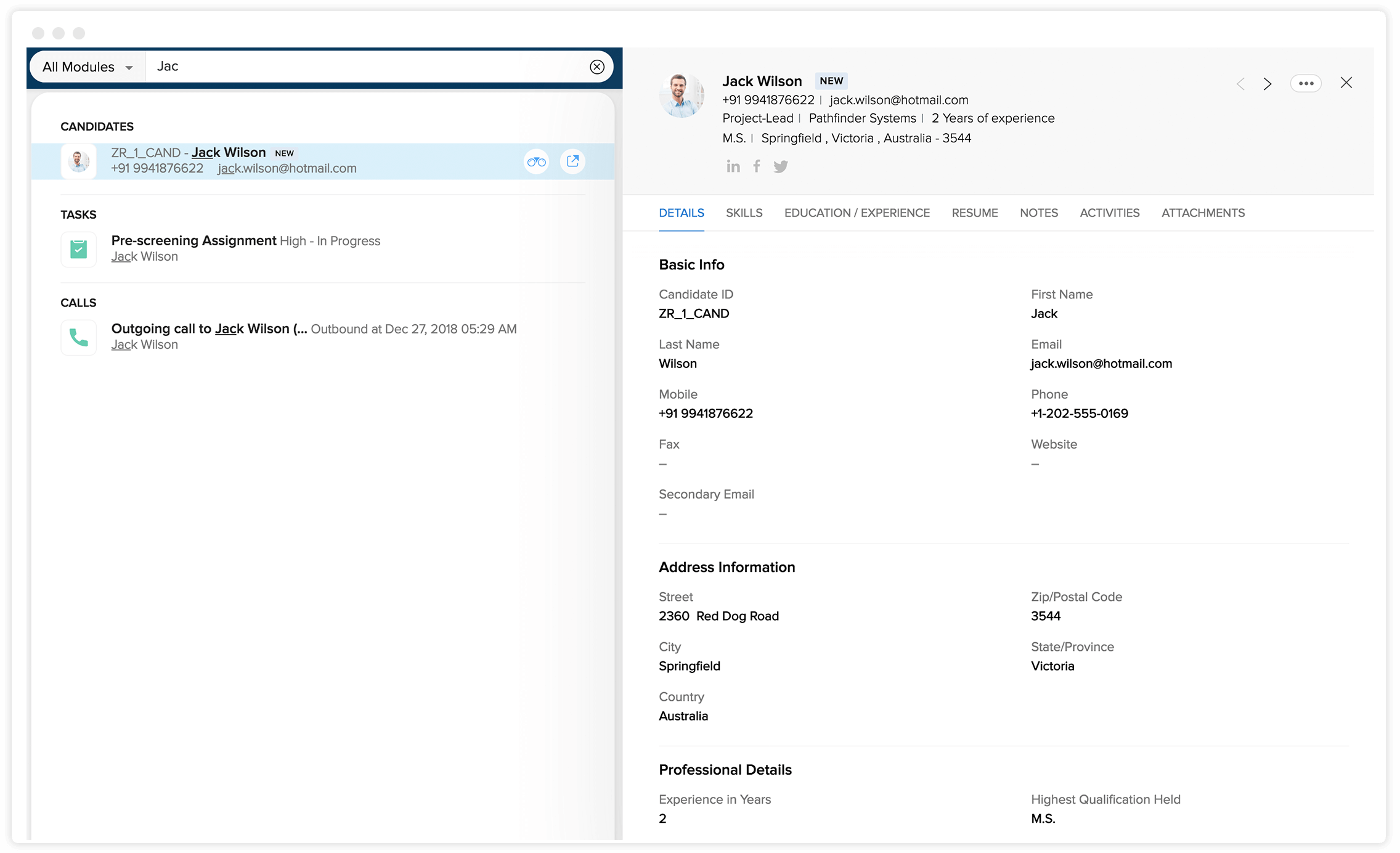 使用 Recruit 的智能搜索功能开启即刻搜索和查找记录的能力,该功能在您键入时便开始搜索,因此搜索会在您结束键入之前完成。您的关键字会与您当前所在模块中的记录匹配,并显示相应的结果。然后,您可以从搜索结果中访问快速视图或某条记录的详细视图,以了解更多信息。