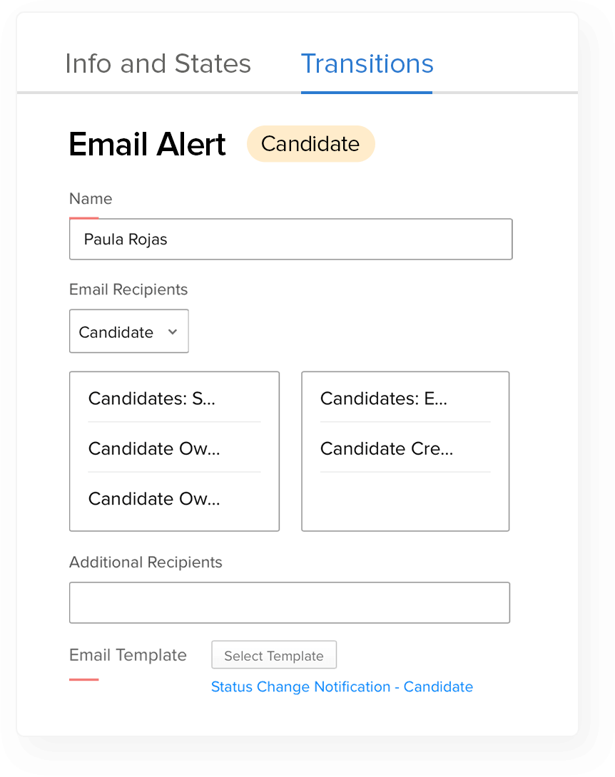 拖放您的招聘操作和字段,即可创建您的工作流。指定您希望招聘团队处理每组步骤的顺序,决定何人可以执行哪些操作,并设置完成流程必须满足的条件。