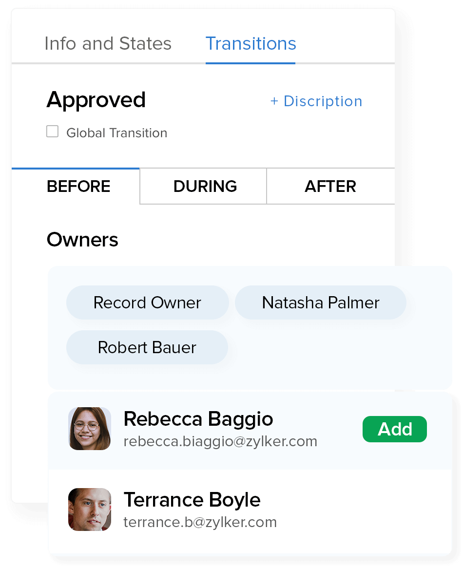 现在,您能够轻松让团队成员保持同步。蓝图是 Zoho Recruit 内部的流程自动化技术,它可向用户说明何时需要采取哪些操作,并按正确顺序向他们提示正确信息。