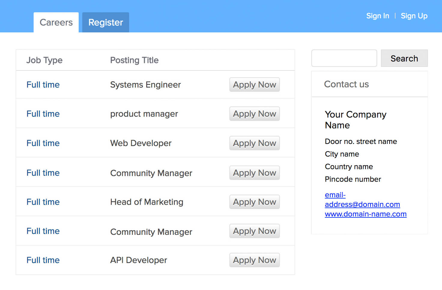 创建招聘页面,列出每个职位空缺及完整说明并接受一次申请多个职位空缺,提升您的应聘者体验。通过高质量的招聘网站提升整体候选人体验。Zoho Recruit 为您提供了列出所有职位空缺和完整描述的工具,并一次接受多个职位空缺的申请。构建适合您品牌的定制化职业页面,并将其嵌入您的网站。您还可以确保该页面适合移动设备,以便候选人可以通过手机或平板电脑申请。