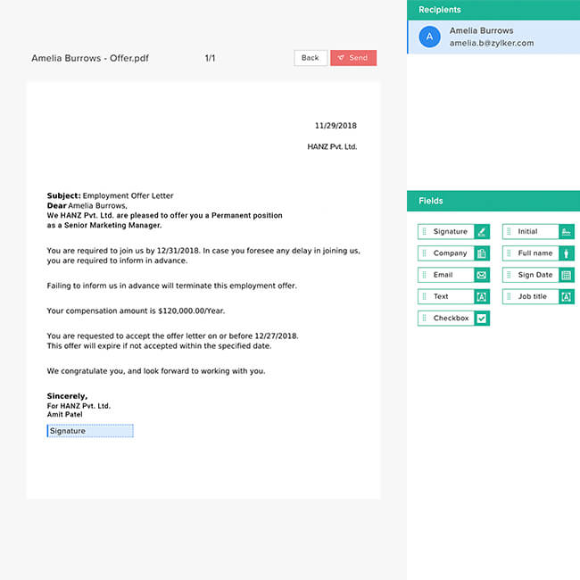 Offer letters made easy with e-sign 使用电子签名轻松发出录用通知书通过 Zoho Sign/Docu Sign/Adobe Sign 获取候选人以数字方式传输的接受录用的信息。只需单击几下鼠标,即可发送包含您电子签名的录用通知书。