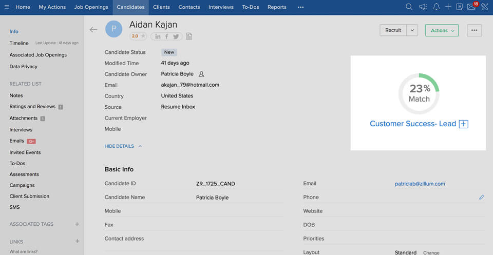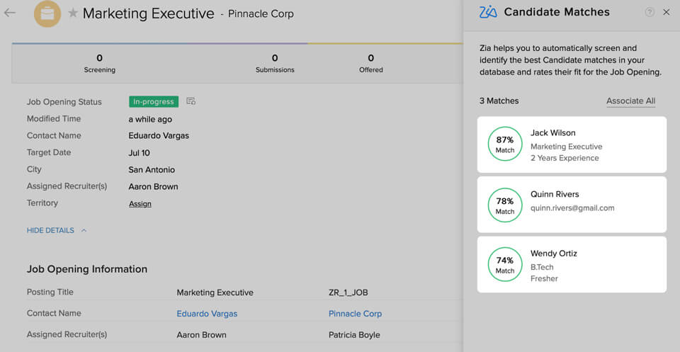Perfect candidate matches 使用Zia更快地匹配和关联合适的候选人。获取根据其与工作要求的匹配程度进行评分和排名的候选人列表。