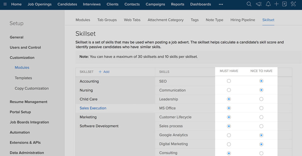 Hire people with right skillset 在发布职位之前,要先设置好候选人应聘职位需要具备的的必备技能或者加分技能,Zoho Recruit 的AI引擎会在几秒内计算申请人的技能得分并快速识别出适合的候选人。