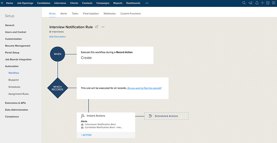 Automate your recruiting process 根据预定义的标准将任务分配给用户。当某个规则被触发时,与该规则关联的提醒、任务和字段更新将被激活执行。