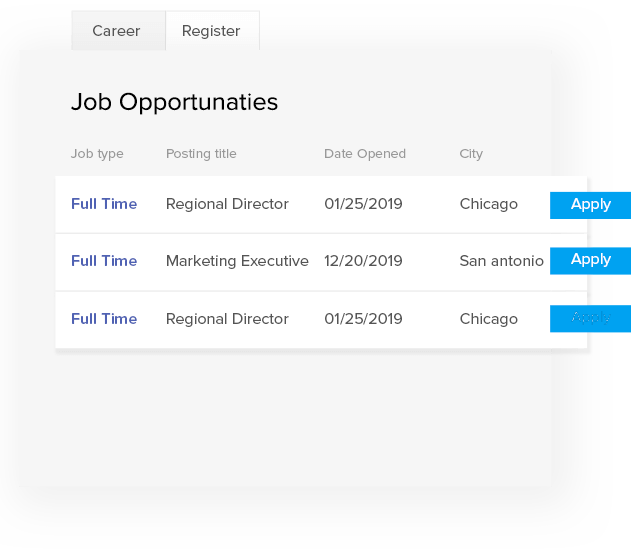 Candidate portal 将求职者直接引入您的招聘系统,并确定合适的候选人。求职者可以申请特定职位、提交有关信息以寻求未来的工作机会,并跟踪职位状态。