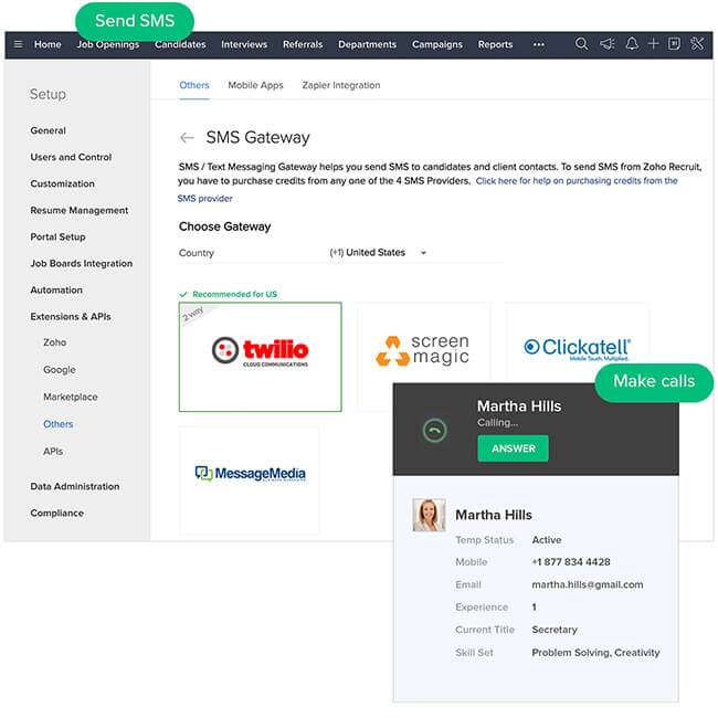 Send SMS/ Make calls 跳出收件箱的局限,使用应用程序的短信通知服务通知求职者和客户。Zoho Phonebridge 支持招聘人员通过 Zoho Recruit 界面拨打电话和发送提醒。