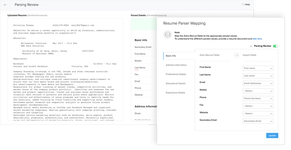 Parse Resumes 利用 Zoho Recruit 的简历解析工具来减少复杂工作,并快速提取候选人、联系人和工作记录等信息,从而减少大量时间。