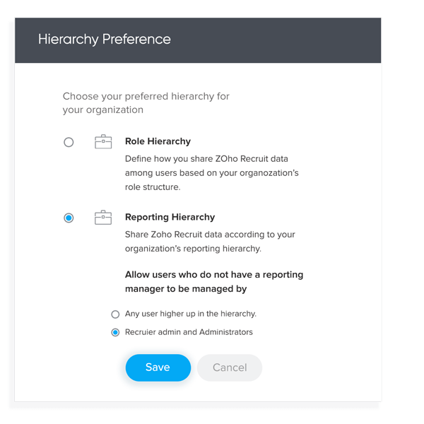 Set up a Reporting heirachy 定义您如何根据您机构的角色结构在各用户间共享您的 Zoho Recruit 数据,并指定有权访问或查看数据的人员。