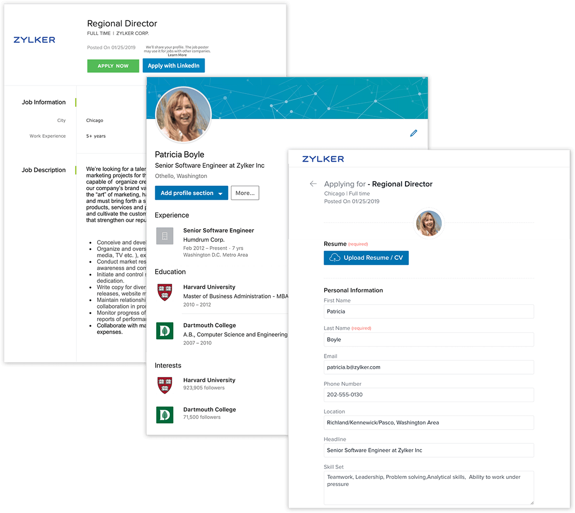 通过 Apply with LinkedIn 简化应聘者的申请流程。借助此功能,应聘者可以使用其 LinkedIn 个人资料自动填写求职表。无需手动输入数据,提高申请者转化率,改善应聘者的整体体验,最终扩大您的人才库。