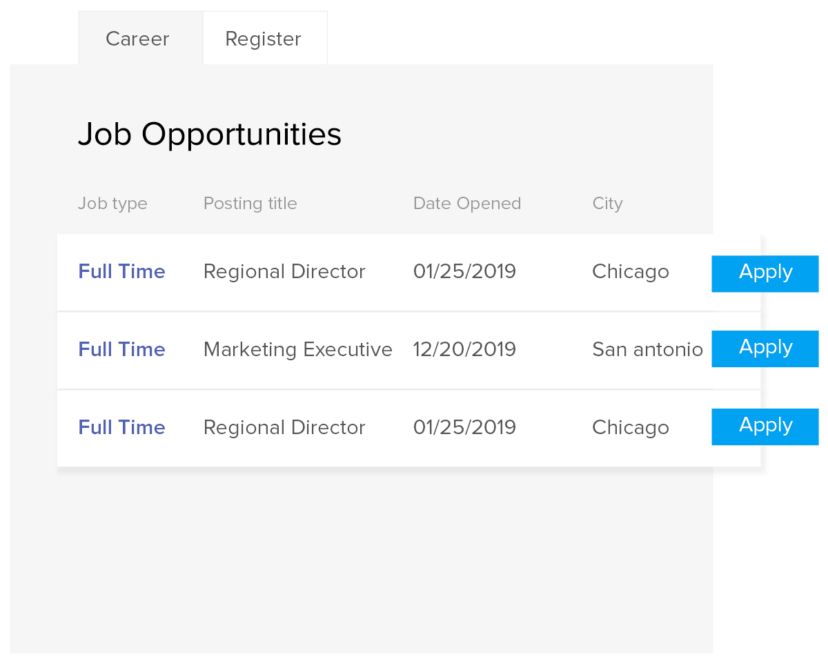 免费求职平台让您可以在不增加成本的情况下,寻找优秀的应聘者。通过 Zoho Recruit 的免费在线职位发布功能,您可以编写职位描述,选择平台,然后公布职位空缺。