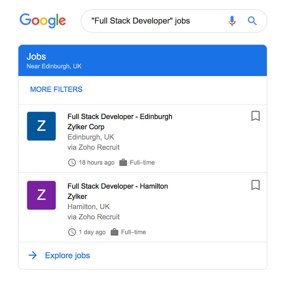 在 Google 上为您的所有职位空缺自动编制索引,以提高曝光度并吸引更多应聘者。Google 的增强搜索功能将汇总求职平台和招聘网站的职位列表,并且在 Google 搜索中突出显示这些信息。