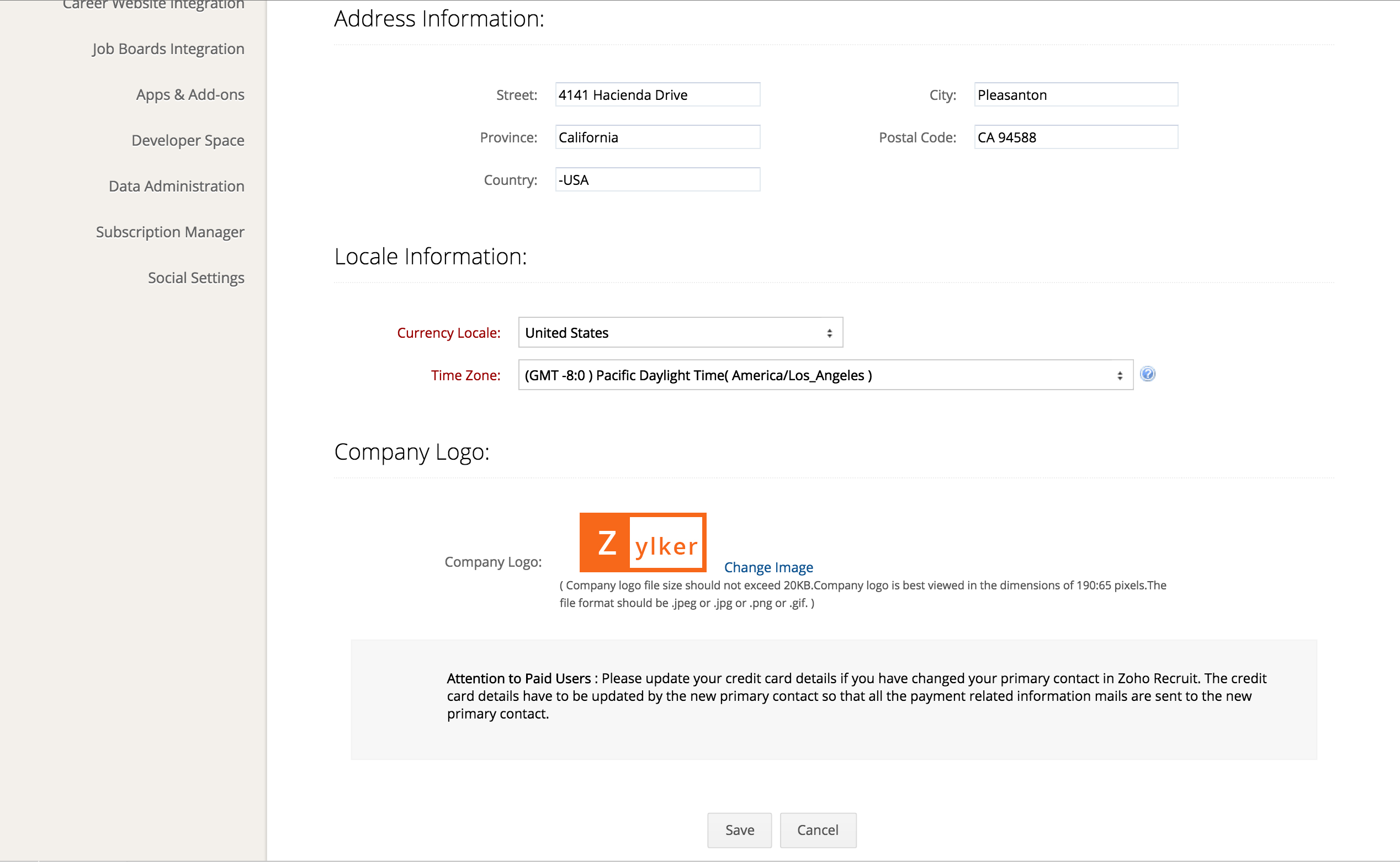 将默认的 Zoho Recruit Logo 更改为个人公司 Logo,从而为您提供个性化的招聘系统外观。