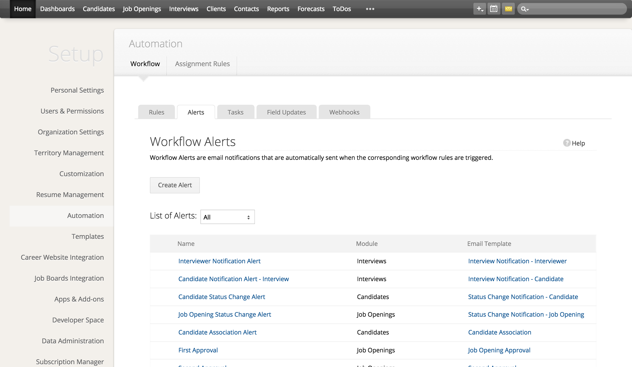当系统添加应聘者、职位空缺、客户和联系人时,Zoho Recruit 会自动发出邮件提醒通知用户,使招聘人员能够快速构建下一级别活动。