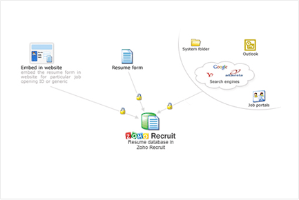 Zoho Recruit automatically captures and imports resumes from a number of sources: e-mail attachments, from your website, from your Outlook Inbox and more. You’ll attract more candidates…and efficiently manage all their resumes in one place.