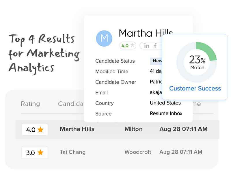 使用 Zoho Recruit 的人工智能语义搜索,根据合适的技能和管理级别,快速、轻松地整理应聘者信息。